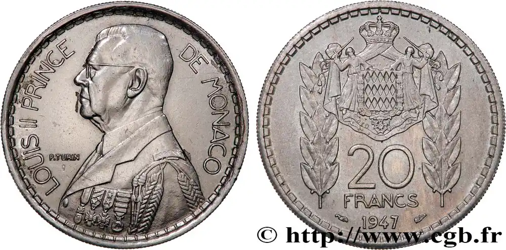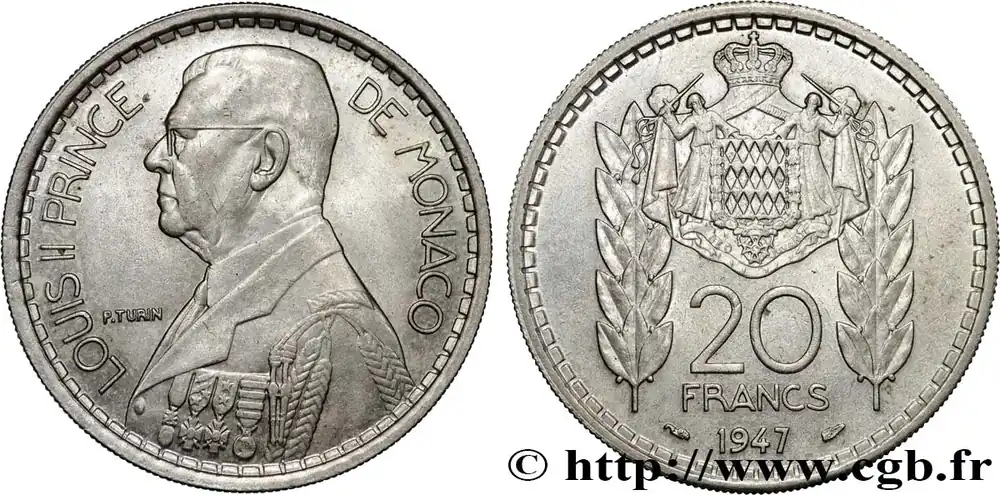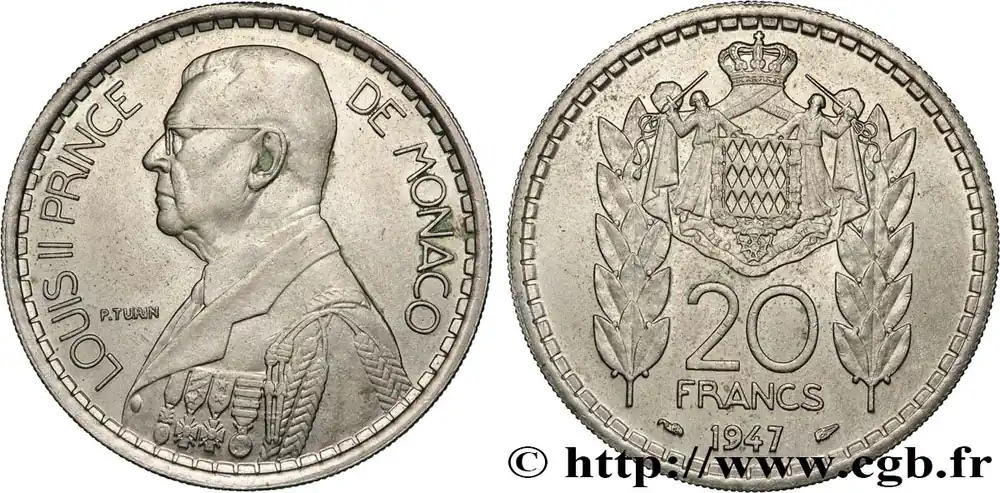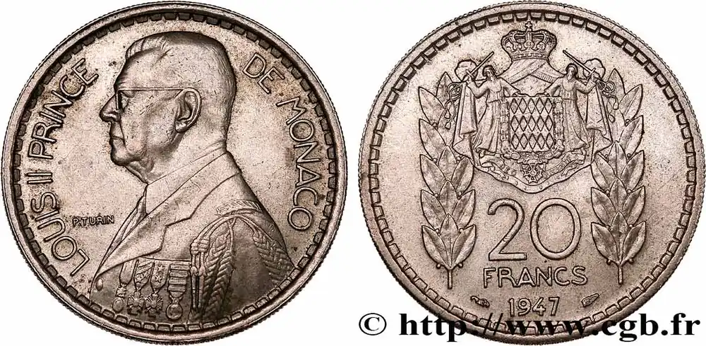 Type : 20 Francs prince Louis IIDate : 1947Nom de l’atelier/ville : ParisQuantité frappée : 1000000Métal : cupro-nickelDiamètre : 30 mmAxe des coins : 6 h.Poids : 10 g.Tranche : striéeRéférence ouvrage :G.2019.137  – KM20/124 AversTitulature avers : LOUIS II PRINCE DE MONACO.Description avers : Buste à gauche en grand uniforme.ReversTitulature revers : 20/ FRANCS/ 1947.Description revers : Armoiries de Monaco entourée de deux branches de laurier.HistoriqueMONACO