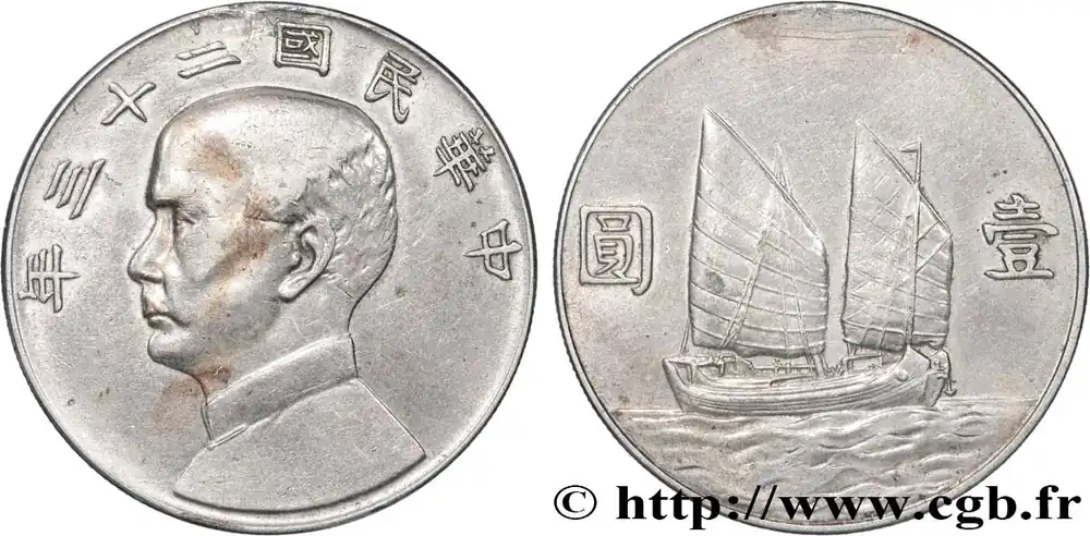 Type : 1 Dollar Sun Yat-Sen an 23Date : 1934Quantité frappée : 128740000Métal : argentTitre en millième : 880 ‰Diamètre : 39 mmAxe des coins : 12 h.Poids : 26,70 g.Tranche : canneléeSlabPCGS : AUCommentaires sur l’état de conservation :Monnaie nettoyée(cleaned) sous coque PCGS Genuine Cleaned-au DetailRéférence ouvrage :KM20/345 – L&M110 AversTitulature avers : (LÉGENDE EN CHINOIS)年三十二國民華中.Description avers : buste à gauche de Sun Yat-Sen.ReversTitulature revers : (LÉGENDE EN CHINOIS) 圓 – 壹.Description revers : jonque.HistoriqueCHINE