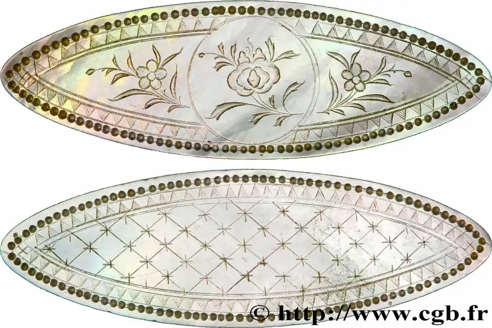 Type : Jeton de jeux en nacreDate : XIXeQuantité frappée : -Métal : nacreDiamètre : 31 mmAxe des coins : 12 h.Poids : 0,43 g.Tranche : lisseRéférence ouvrage :KM20/- AversReversCommentaireJeton de jeux gravé à la main dans la nacre. Ce jeton de jeu date du XIXe siècle. Ces objets ne sont pas particulièrement rares mais d’une grande beauté et d’une extrême finesse, ils témoignent du raffinement de l’art chinois.Dimensions : 31 x 12 mm.HistoriqueCHINE