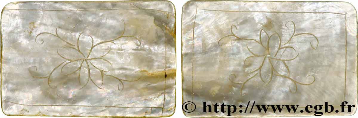 Type : Jeton de jeux en nacreDate : XIXeQuantité frappée : -Métal : nacreDiamètre : 51 mmAxe des coins : 12 h.Poids : 1,67 g.Tranche : lisseRéférence ouvrage :KM20/- AversReversCommentaireJeton de jeux gravé à la main dans la nacre. Ce jeton de jeu date du XIXe siècle. Ces objets ne sont pas particulièrement rares mais d’une grande beauté et d’une extrême finesse, ils témoignent du raffinement de l’art chinois.HistoriqueCHINE