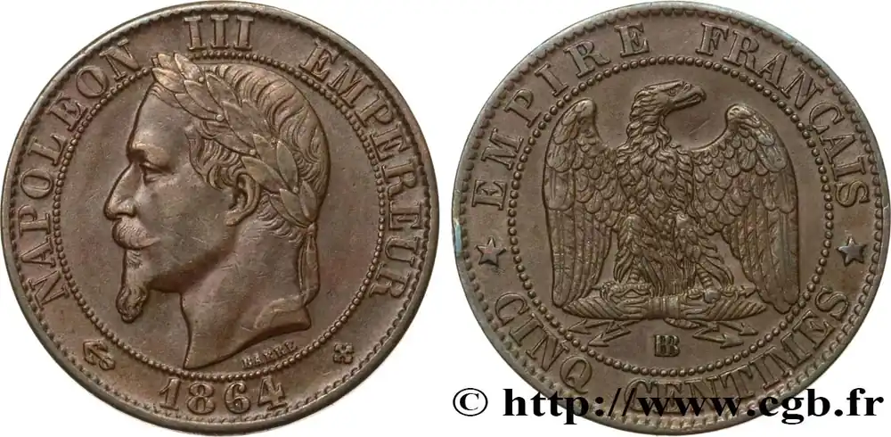 Type : Cinq centimes Napoléon III, tête lauréeDate : 1861Nom de l’atelier/ville : ParisQuantité frappée : 8137339Métal : bronzeDiamètre : 25,29 mmAxe des coins : 6 h.Poids : 4,94 g.Tranche : lisseRéférence ouvrage :Classement FRANC 2023 / FRANC 2023 classificationF.117/4AversTitulature avers : NAPOLEON III – EMPEREUR// (ANCRE) 1861 (MM).Description avers : Tête laurée de Napoléon III à gauche ; signé BARRE au-dessous.ReversTitulature revers : EMPIRE FRANÇAIS// * CINQ CENTIMES *.Description revers : Aigle debout de face sur un foudre, les ailes ouvertes, la tête tournée à droite ; au-dessous, la lettre d’atelier A.HistoriqueSECOND EMPIRE(02/12/1852-04/09/1870) Proclamé empereur sous le nom de Napoléon III, Louis Napoléon fait son entrée solennelle à Paris le 2 décembre 1852. Il épouse Eugénie Marie de Montijo, aristocrate espagnole, en janvier 1853. Son règne peut se diviser en trois périodes : l’Empire autoritaire jusqu’en 1860 ; l’Empire libéral de 1860 à 1870 puis l’Empire parlementaire en 1870. Durant l’Empire autoritaire, Napoléon III exerce son pouvoir sans partage, contrôle la presse tandis que les journaux pratiquent l’autocensure pour éviter leur suppression. Les préfets exercent une puissance illimitée dans les départements, les maires, les fonctionnaires sont nommés par le gouvernement. Comme sous le Premier Empire, l’Éducation et l’Université sont surveillées. Maintenant les grands principes de la révolution, la souveraineté du peuple est continuée grâce à la consultation par plébiscite. Sur le plan économique, l’essor est important, l’industrialisation se développe ainsi que les organismes de crédit et les grands magasins. Le prestige militaire est accru par la guerre de Crimée qui permet à la France de jouer un rôle international. L’attentat d’Orsini (janvier 1858) n’empêche nullement la France d’intervenir en Italie pour faire triompher le principe des nationalités et permet le rattachement de Nice et de la Savoie par le traité de Turin (mars 1860). Dès 1860, l’Empire évolue vers plus de libertés : traité libre-échangiste de commerce avec l’Angleterre, apparition d’une faible opposition dans le Corps législatif, octroi du droit de grève (1864), libéralisation de la presse (1868). Sur le plan international, la France acquiert la Nouvelle-Calédonie, la Cochinchine et encourage le creusement du canal de Suez par Ferdinand de Lesseps. Au Mexique, le soutien à Maximilien et à l’Autriche est toutefois un échec. Les élections de 1869 sont très mauvaises pour le régime et l’opposition obtient 45 % des voix. Le régime évolue alors vers un Empire parlementaire en appelant Émile Ollivier, chef du parti orléaniste et libéral, au pouvoir. Après Sadowa en 1866 où la Prusse écrase l’Autriche, l’affaire du trône d’Espagne et de la dépêche d’Ems entraînent la guerre qui est déclarée le 19 juillet 1870. Accumulant les revers, l’armée française est encerclée dans Metz puis Napoléon III, malade, capitule à Sedan le 2 septembre. Aussitôt la nouvelle connue, la déchéance de l’Empire est annoncée par Gambetta puis la République est proclamée le 4 septembre. Napoléon III est alors emmené en captivité en Hesse puis part dans le Kent où il meurt en 1873.