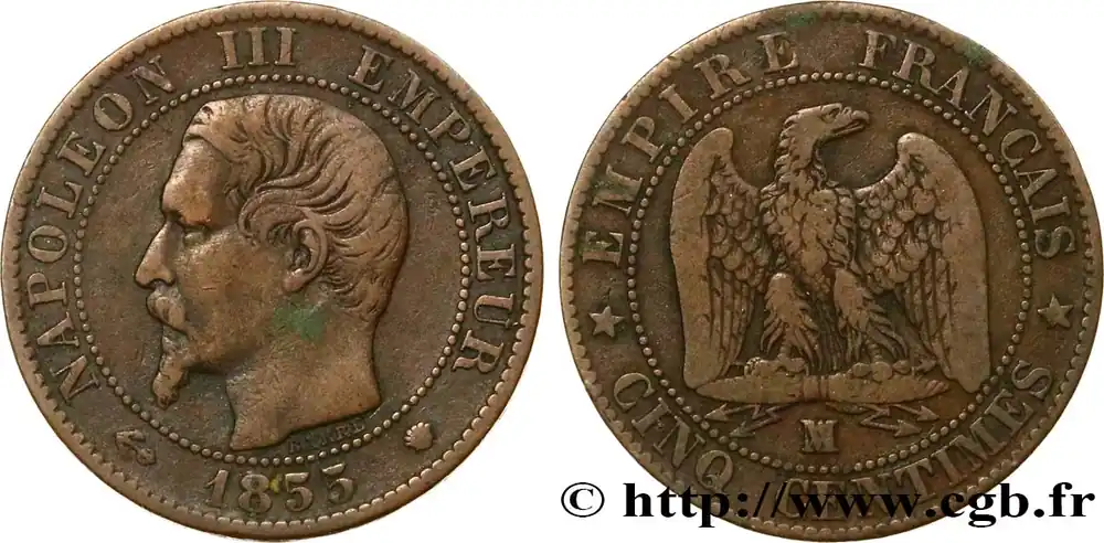 Type : Cinq centimes Napoléon III, tête nueDate : 1853Nom de l’atelier/ville : LyonQuantité frappée : 5209981Métal : bronzeDiamètre : 25 mmAxe des coins : 6 h.Poids : 4,71 g.Tranche : lisseRéférence ouvrage :Classement FRANC 2023 / FRANC 2023 classificationF.116/4AversTitulature avers : (LEVRETTE) NAPOLEON III EMPEREUR (MM)// 1853.Description avers : Tête nue de Napoléon III à gauche ; signé BARRE au-dessous.ReversTitulature revers : EMPIRE FRANÇAIS// * CINQ CENTIMES *.Description revers : Aigle debout de face sur un foudre, les ailes ouvertes, la tête tournée à droite ; au-dessous, D.HistoriqueSECOND EMPIRE(02/12/1852-04/09/1870) Proclamé empereur sous le nom de Napoléon III, Louis Napoléon fait son entrée solennelle à Paris le 2 décembre 1852. Il épouse Eugénie Marie de Montijo, aristocrate espagnole, en janvier 1853. Son règne peut se diviser en trois périodes : l’Empire autoritaire jusqu’en 1860 ; l’Empire libéral de 1860 à 1870 puis l’Empire parlementaire en 1870. Durant l’Empire autoritaire, Napoléon III exerce son pouvoir sans partage, contrôle la presse tandis que les journaux pratiquent l’autocensure pour éviter leur suppression. Les préfets exercent une puissance illimitée dans les départements, les maires, les fonctionnaires sont nommés par le gouvernement. Comme sous le Premier Empire, l’Éducation et l’Université sont surveillées. Maintenant les grands principes de la révolution, la souveraineté du peuple est continuée grâce à la consultation par plébiscite. Sur le plan économique, l’essor est important, l’industrialisation se développe ainsi que les organismes de crédit et les grands magasins. Le prestige militaire est accru par la guerre de Crimée qui permet à la France de jouer un rôle international. L’attentat d’Orsini (janvier 1858) n’empêche nullement la France d’intervenir en Italie pour faire triompher le principe des nationalités et permet le rattachement de Nice et de la Savoie par le traité de Turin (mars 1860). Dès 1860, l’Empire évolue vers plus de libertés : traité libre-échangiste de commerce avec l’Angleterre, apparition d’une faible opposition dans le Corps législatif, octroi du droit de grève (1864), libéralisation de la presse (1868). Sur le plan international, la France acquiert la Nouvelle-Calédonie, la Cochinchine et encourage le creusement du canal de Suez par Ferdinand de Lesseps. Au Mexique, le soutien à Maximilien et à l’Autriche est toutefois un échec. Les élections de 1869 sont très mauvaises pour le régime et l’opposition obtient 45 % des voix. Le régime évolue alors vers un Empire parlementaire en appelant Émile Ollivier, chef du parti orléaniste et libéral, au pouvoir. Après Sadowa en 1866 où la Prusse écrase l’Autriche, l’affaire du trône d’Espagne et de la dépêche d’Ems entraînent la guerre qui est déclarée le 19 juillet 1870. Accumulant les revers, l’armée française est encerclée dans Metz puis Napoléon III, malade, capitule à Sedan le 2 septembre. Aussitôt la nouvelle connue, la déchéance de l’Empire est annoncée par Gambetta puis la République est proclamée le 4 septembre. Napoléon III est alors emmené en captivité en Hesse puis part dans le Kent où il meurt en 1873.
