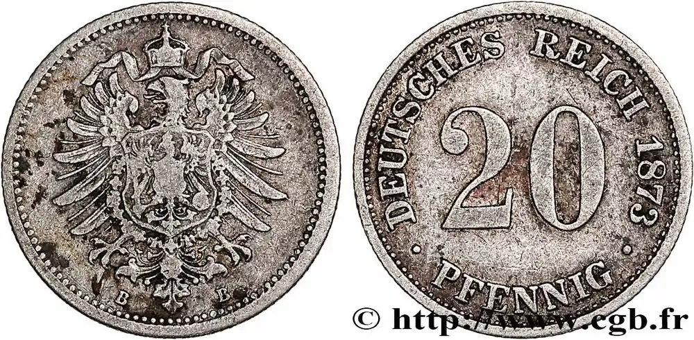 Type : 20 Pfennig aigle impérial héraldiqueDate : 1874Nom de l’atelier/ville : DarmstadtQuantité frappée : 1841516Métal : argentTitre en millième : 900 ‰Diamètre : 16 mmAxe des coins : 12 h.Poids : 1,03 g.Tranche : striéeRéférence ouvrage :AKS.8 – KM19/5 AversTitulature avers : H – H.Description avers : aigle impérial couronné.ReversTitulature revers : DEUTSCHES REICH 1874 // 20 / . PFENNIG ..Description revers : dans le champ.HistoriqueALLEMAGNE