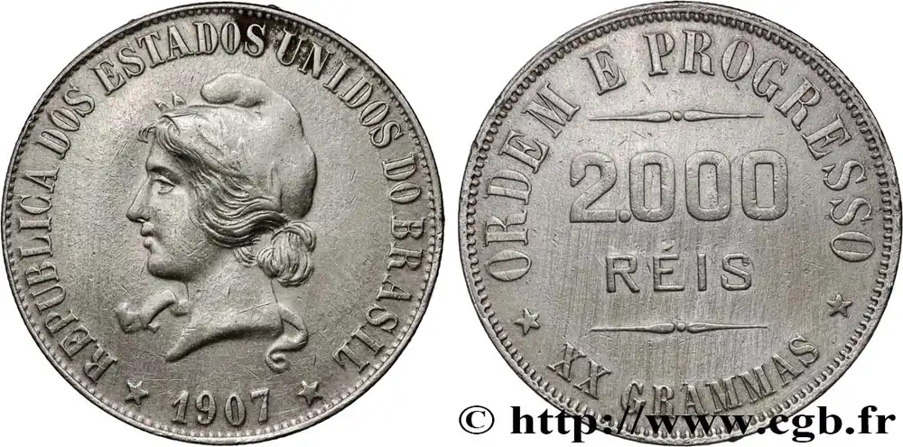 Type : 2000 ReisDate : 1910Métal : argentTitre en millième : 500 ‰Diamètre : 33 mmAxe des coins : 6 h.Poids : 19,84 g.Commentaires sur l’état de conservation :La monnaie a été nettoyéeRéférence ouvrage :KM20/508 AversTitulature avers : REPUBLICA DOS ESTADOS UNIDOS DO BRASIL * 1910*.Description avers : Tête de la liberté à droite coiffée du bonnet phrygien.ReversTitulature revers : ORDEM E PROGRESSO * XX GRAMMAS*.Description revers : 2. 000 / REIS.HistoriqueBRÉSIL