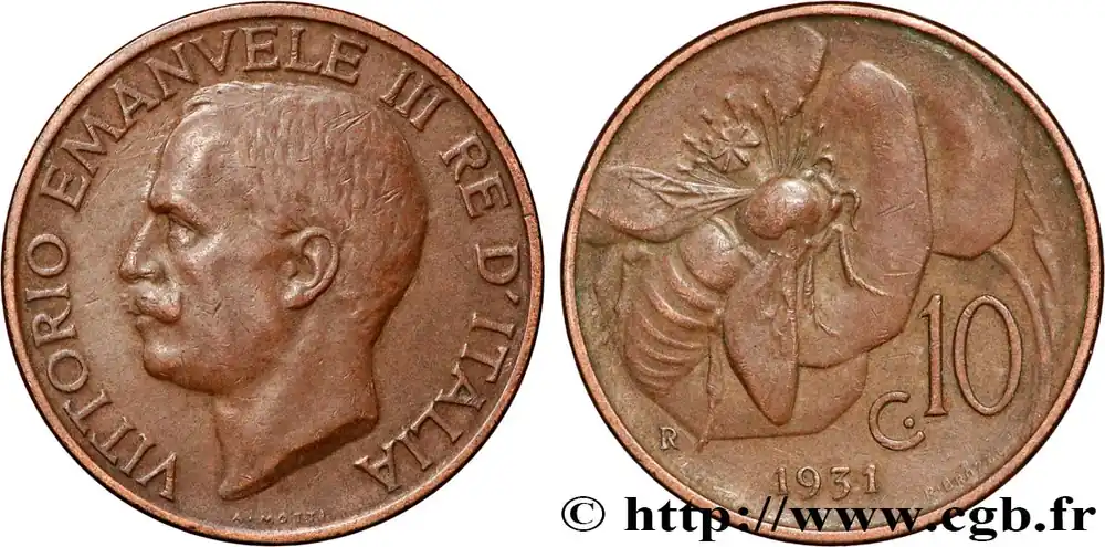 Type : 10 Centesimi Victor Emmanuel IIIDate : 1921Nom de l’atelier/ville : RomeQuantité frappée : 66510000Métal : cuivreDiamètre : 22,5 mmAxe des coins : 6 h.Poids : 5,33 g.Tranche : lisseRéférence ouvrage :Mont.330 – KM20/60 AversTitulature avers : VITTORIO EMANVELE III RE D’ITALIA.Description avers : portrait à gauche.ReversTitulature revers : C.10 / 1921.Description revers : abeille butinant une fleur.HistoriqueITALIE