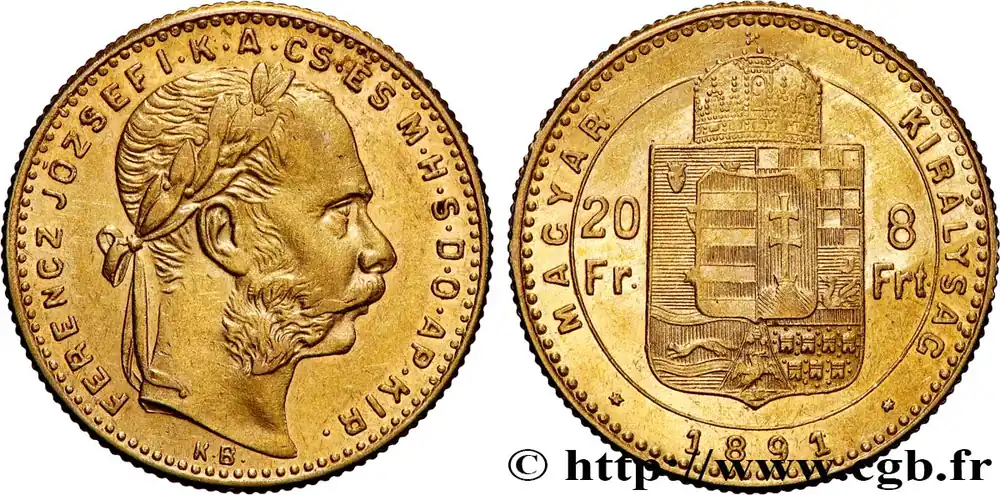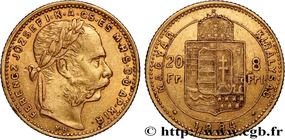 Type : 20 Francs or ou 8 Forint François-Joseph IerDate : 1874Nom de l’atelier/ville : KremnitzQuantité frappée : 240359Métal : orTitre en millième : 900 ‰Diamètre : 21 mmAxe des coins : 12 h.Poids : 6,45 g.Tranche : canneléeCommentaires sur l’état de conservation :Traces de nettoyageRéférence ouvrage :KM.19/455.1 AversTitulature avers : FERENCZ JOZSEF I. K. A. CS. ES. M. H. S. D. O. AP. KIR..Description avers : Tête laurée de François-Joseph Ier à droite ; KB sous la tête.ReversTitulature revers : MAGYAR – KIRALYSAG/ 1874.Description revers : Écu couronné surmonté de la couronne de saint André ; dans le champ 20/ Fr – 8/ Frt.Traduction revers : (Royaume de Hongrie).Commentairej.HistoriqueOR, PALLADIUM ET PLATINE INVESTISSEMENTSécurisez et diversifiez votre épargne avec les métaux précieux :Dans un contexte d’instabilité politique et économique croissante, diversifier son épargne peut être une démarche judicieuse. Les métaux précieux comme l’or, le palladium et le platine constituent des actifs tangibles souvent prisés en raison de leur caractère intemporel et de leur résilience face aux fluctuations des marchés.Pour répondre à des besoins variés, l’achat de pièces officielles en or, palladium ou platine est une option flexible et adaptée. Ces pièces, disponibles à l’unité ou en lot, permettent à chacun d’ajuster ses choix selon ses objectifs et son budget, sans engagement à long terme.Un processus simple et sécurisé :Nous proposons une livraison sécurisée et garantie. Les paiements peuvent être effectués par carte bancaire ou par virement, bien que certaines transactions puissent nécessiter un règlement exclusivement par virement bancaire. Une pièce d’identité valide (carte nationale d’identité ou passeport) sera demandée pour finaliser votre achat.Stockage en toute sécurité et confidentialité :Le département Investissement de CGB Numismatique Paris met à votre disposition des solutions de stockage offrant une sécurité renforcée et une confidentialité optimale pour vos achats en or, palladium et platine.Contactez-nous pour plus d’informations :Pour toute question ou pour passer commande, prenez contact avec notre responsable des achats/ventes de métaux précieux : par email à [email protected] ou par téléphone. Nous mettons à votre disposition des informations générales et des services pour vous accompagner dans vos projets d’investissement.CGB Numismatique Paris agit en tant que fournisseur de métaux précieux et ne fournit aucun conseil en investissement. La valeur des métaux précieux peut fluctuer, et les performances passées ne garantissent pas les résultats futurs. L’achat de métaux précieux doit être considéré comme une stratégie de préservation de valeur plutôt qu’un investissement spéculatif. Conformément à l’article L.221-28 du Code de la consommation, le droit de rétractation ne s’applique pas aux achats d’or d’investissement, dont le prix dépend des fluctuations des marchés financiers.