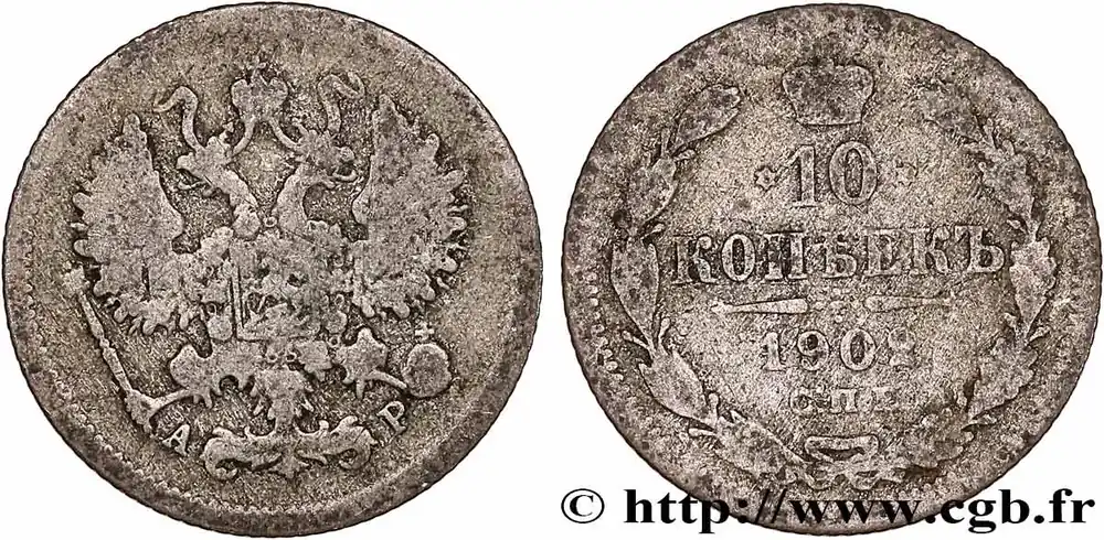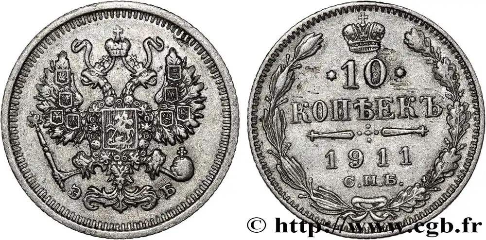 Type : 10 Kopecks aigle bicéphaleDate : 1910Nom de l’atelier/ville : Saint-PetersbourgQuantité frappée : 8210000Métal : argentTitre en millième : 500 ‰Diamètre : 17,2 mmAxe des coins : 12 h.Poids : 1,79 g.Tranche : striéeRéférence ouvrage :KM20/20a.2 AversTitulature avers : (LÉGENDE CYRILLIQUE) ЭБ.Description avers : Aigle bicéphale héraldique couronné.ReversTitulature revers : (LÉGENDE CYRILLIQUE) *10* / КОПѢЕКЪ / 1910 / С.П.Б..Description revers : dans une couronne formée d’une branche d’olivier et d’une branche de chêne surmontée d’une petite couronne.HistoriqueRUSSIE