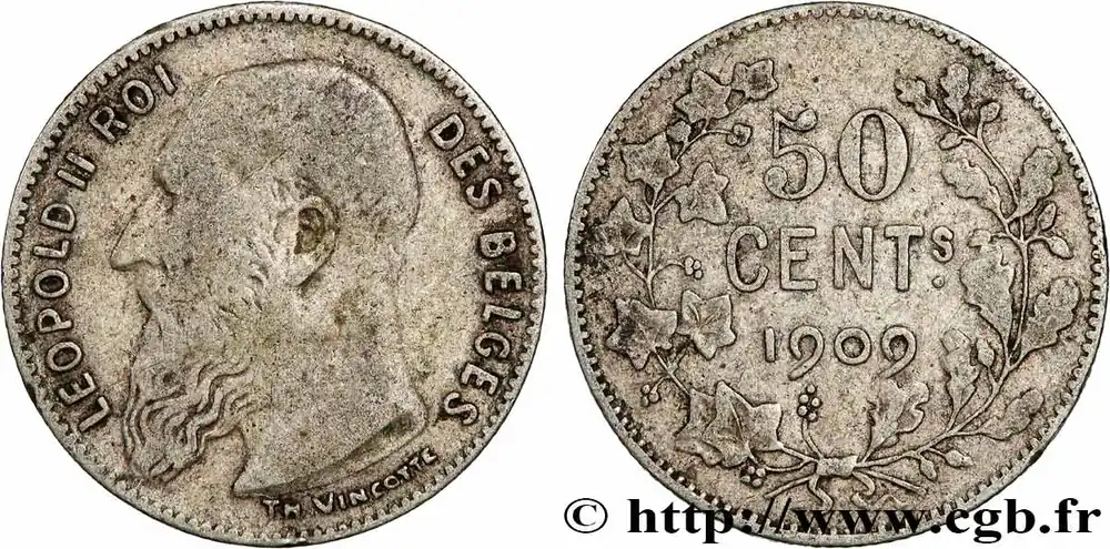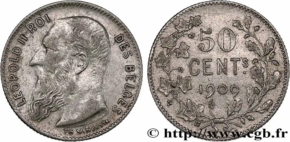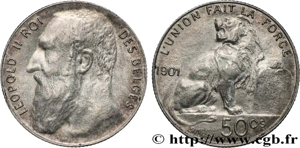 Type : 50 Centimes Léopold II légende en françaisDate : 1901Quantité frappée : 3000000Métal : argentTitre en millième : 835 ‰Diamètre : 18 mmAxe des coins : 6 h.Poids : 2,46 g.Tranche : canneléeRéférence ouvrage :KM20/50 AversTitulature avers : LEOPOLD II ROI – DES BELGES.Description avers : Tête à droite de Léopold II.ReversTitulature revers : L’UNION FAIT LA FORCE – 50 CS.Description revers : lion assis tenant le constitution.HistoriqueBELGIQUE