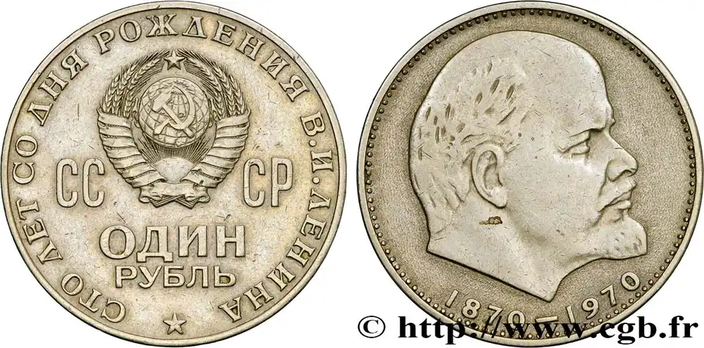 Type : 1 Rouble URSS 100e anniversaire de la naissance de LénineDate : 1970Quantité frappée : 99989000Métal : cupro-nickel-zincDiamètre : 31 mmAxe des coins : 12 h.Poids : 12,77 g.Tranche : inscrite en creuxRéférence ouvrage :KM20/141 AversTitulature avers : (LÉGENDE EN CYRILLIQUE) СТО ЛЕТ СО ДНЯ РОЖДЕНИЯ В.И.ЛЕНИНА // СС – СР // ОДИН / РУБЛЬ.Description avers : armoiries de l’URSS.Légende avers : СТО ЛЕТ СО ДНЯ РОЖДЕНИЯ В.И.ЛЕНИНА // СС – СР // ОДИН / РУБЛЬReversTitulature revers : 1870-1970.Description revers : buste à droite de Lénine.HistoriqueRUSSIE – URSS(1922-1991) La Révolution de Février 1917 met fin au régime des tsars de Russie. La République Russe est renversée par les bolcheviks en Octobre 1917. Le 30 décembre 1922, est signé le traité relatif à la formation de l’Union des Républiques Socialistes Soviétiques (URSS). Bien que disposant d’un chef de l’état et d’un chef du gouvernement, l’URSS est en fait dirigé par le chef du Parti communiste de l’Union soviétique, seul parti autorisé entre 1925 et 1990.Le 8 décembre 1991, les présidents de Russie, d’Ukraine et de Biélorussie signent les Accord de Minsk qui proclame la dissolution de l’URSS par ses États fondateurs.