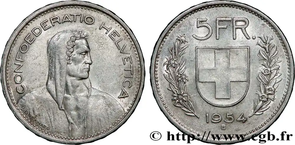 Type : 5 Francs Berger des AlpesDate : 1966Nom de l’atelier/ville : Berne – BQuantité frappée : 9016000Métal : argentTitre en millième : 835 ‰Diamètre : 31 mmPoids : 15 g.Tranche : tranche en reliefRéférence ouvrage :KM20/40 AversTitulature avers : CONFOEDERATIO HELVETICA.Description avers : Buste drapé à droite.Traduction avers : (Confédération helvétique).ReversTitulature revers : 5FR // (DATE) / B.Description revers : écu entre deux rameaux.HistoriqueSUISSE