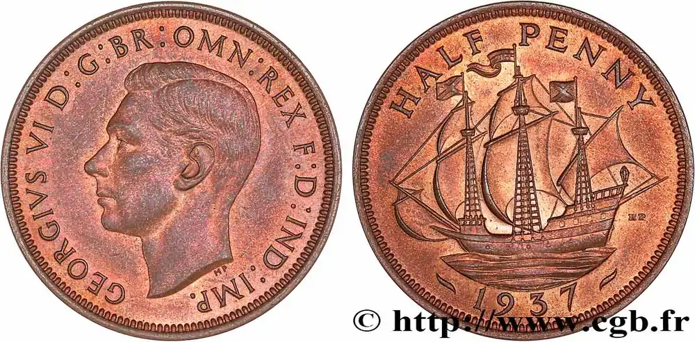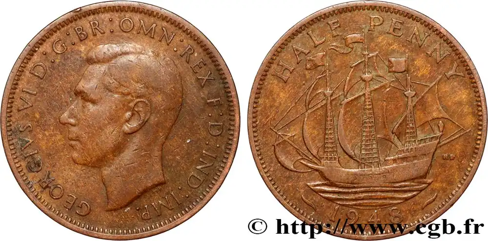 Type : 1/2 Penny Georges VIDate : 1948Quantité frappée : 246947200Métal : cuivreDiamètre : 25 mmAxe des coins : 12 h.Poids : 5,48 g.Tranche : lisseRéférence ouvrage :Sp.4115  – KM20/844 AversTitulature avers : GEORGIVS VI D:G:BR:OMN:REX F:D:IND:IMP:.Description avers : buste à gauche de Georges VI.Traduction avers : (Georges VI par la grâce de Dieu roi de toutes les Bretagnes, défenseur de la foi).ReversTitulature revers : HALF PENNY // 1948.Description revers : voilier Golden Hind de Sir Francis Drake.HistoriqueROYAUME-UNI