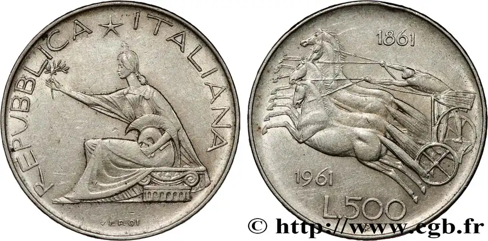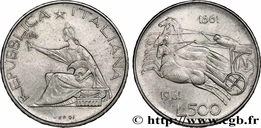 Type : 500 Lire Centenaire de l’Unité ItalienneDate : 1961Nom de l’atelier/ville : RomeQuantité frappée : 27120000Métal : argentTitre en millième : 835 ‰Diamètre : 29 mmAxe des coins : 6 h.Poids : 11,00 g.Tranche : inscrite en relief ° CENTENARIO VNITA D’ITALIA *1861-1961*Référence ouvrage :Mont.03  – KM20/99 AversTitulature avers : REPUBBLICA*ITALIANA.Description avers : figure allégorique de l’Italie.Traduction avers : (République Italienne).ReversTitulature revers : L.500.Description revers : quadrige, inscription en haut 1861 et en bas 1961.CommentaireCette monnaie commémore la création du Royaume d’Italie. Le Royaume de Sardaigne a bénéficie du mouvement de Risorgimento. Après l’expédition des Mille qui permet le rattachement du sud de la péninsule à l’exception d’une partie des états pontificaux, le Royaume d’Italie est proclamé le 17 mars 1861. La Vénitie sera annexée en 1865 et Rome en 1870.HistoriqueITALIE