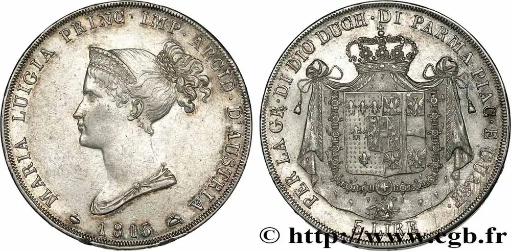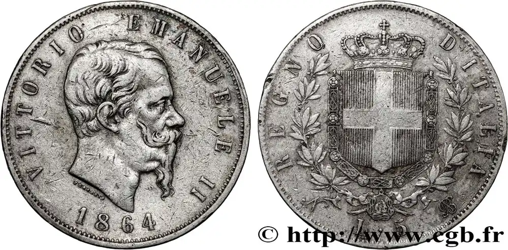 Type : 5 Lire Date : 1844Nom de l’atelier/ville : GênesQuantité frappée : 1043163Métal : argentTitre en millième : 900 ‰Diamètre : 37 mmAxe des coins : 6 h.Poids : 24,88 g.Tranche : en creuxCommentaires sur l’état de conservation :De petits coups sur les deux faces et sur la trancheRéférence ouvrage :Mont.131 – KM.19/130.2 AversTitulature avers : CAR. ALBERTVS. D. G. REX. SARD. CYP. ET HIER./ 1844.Description avers : Tête nue de Charles-Albert à droite ; signé F. sur la tranche du cou.Traduction avers : (Charles Albert par la grâce de Dieu roi de Sardaigne de Chypre et de Jérusalem).ReversTitulature revers : DVX. SAB. GENVAE ET. MONTISF. PRINC. PED. &./ L. – 5.Description revers : Écu couronné entouré du collier de l’Ordre de l’Annonciade entre deux branches d’olivier.Traduction revers : (Duc de Savoie, Gênes et Montferrat, prince du Piémont etc).HistoriqueITALIE – ROYAUME DE SARDAIGNE – CHARLES-ALBERT(27/041831-24/03/1849) Charles-Albert (2/10/1798- 28/08/1849) est le fils de Charles-Emmanuel de Savoie. Il succède à son oncle en 1831. Après la défaite de Novarre, il abdique, le 24 mars 1849, au profit de son fils Victor-Emmanuel II. Il meurt à Porto le 28 août de la même année.