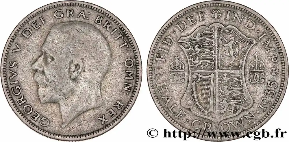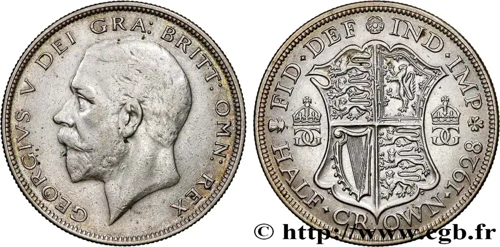 Type : 1/2 Crown Georges VDate : 1922Quantité frappée : 16396999Métal : argentTitre en millième : 500 ‰Diamètre : 32,3 mmAxe des coins : 12 h.Poids : 13,51 g.Tranche : canneléeRéférence ouvrage :Sp.4021 – KM20/818.1a AversTitulature avers : GEORGIVS V DEI GRA: BRITT: OMN: REX.Description avers : portrait à gauche du roi Georges V.ReversTitulature revers : FID: DEF: IND: IMP: / . HALF . (DATE) . CROWN.Description revers : écu couronné du Royaume-Uni, motto HON. SOIT. QVI MAL . Y PENSE..HistoriqueROYAUME-UNI