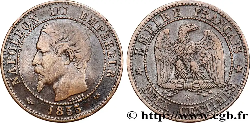 Type : Deux centimes Napoléon III, tête nueDate : 1853Nom de l’atelier/ville : BordeauxQuantité frappée : 116625Métal : bronzeDiamètre : 20 mmAxe des coins : 6 h.Poids : 2,08 g.Tranche : lisseCommentaires sur l’état de conservation :Exemplaire nettoyéRéférence ouvrage :Classement FRANC 2023 / FRANC 2023 classificationF.107/6AversTitulature avers : (LEVRETTE) NAPOLEON III EMPEREUR (MM)// (MILLÉSIME).Description avers : Tête nue de Napoléon III à gauche ; signé BARRE au-dessous.ReversTitulature revers : EMPIRE FRANÇAIS// * DEUX CENTIMES *.Description revers : Aigle debout de face sur un foudre, les ailes ouvertes, la tête tournée à droite ; au-dessous, la lettre d’atelier.HistoriqueSECOND EMPIRE(02/12/1852-04/09/1870) Proclamé empereur sous le nom de Napoléon III, Louis Napoléon fait son entrée solennelle à Paris le 2 décembre 1852. Il épouse Eugénie Marie de Montijo, aristocrate espagnole, en janvier 1853. Son règne peut se diviser en trois périodes : l’Empire autoritaire jusqu’en 1860 ; l’Empire libéral de 1860 à 1870 puis l’Empire parlementaire en 1870. Durant l’Empire autoritaire, Napoléon III exerce son pouvoir sans partage, contrôle la presse tandis que les journaux pratiquent l’autocensure pour éviter leur suppression. Les préfets exercent une puissance illimitée dans les départements, les maires, les fonctionnaires sont nommés par le gouvernement. Comme sous le Premier Empire, l’Éducation et l’Université sont surveillées. Maintenant les grands principes de la révolution, la souveraineté du peuple est continuée grâce à la consultation par plébiscite. Sur le plan économique, l’essor est important, l’industrialisation se développe ainsi que les organismes de crédit et les grands magasins. Le prestige militaire est accru par la guerre de Crimée qui permet à la France de jouer un rôle international. L’attentat d’Orsini (janvier 1858) n’empêche nullement la France d’intervenir en Italie pour faire triompher le principe des nationalités et permet le rattachement de Nice et de la Savoie par le traité de Turin (mars 1860). Dès 1860, l’Empire évolue vers plus de libertés : traité libre-échangiste de commerce avec l’Angleterre, apparition d’une faible opposition dans le Corps législatif, octroi du droit de grève (1864), libéralisation de la presse (1868). Sur le plan international, la France acquiert la Nouvelle-Calédonie, la Cochinchine et encourage le creusement du canal de Suez par Ferdinand de Lesseps. Au Mexique, le soutien à Maximilien et à l’Autriche est toutefois un échec. Les élections de 1869 sont très mauvaises pour le régime et l’opposition obtient 45 % des voix. Le régime évolue alors vers un Empire parlementaire en appelant Émile Ollivier, chef du parti orléaniste et libéral, au pouvoir. Après Sadowa en 1866 où la Prusse écrase l’Autriche, l’affaire du trône d’Espagne et de la dépêche d’Ems entraînent la guerre qui est déclarée le 19 juillet 1870. Accumulant les revers, l’armée française est encerclée dans Metz puis Napoléon III, malade, capitule à Sedan le 2 septembre. Aussitôt la nouvelle connue, la déchéance de l’Empire est annoncée par Gambetta puis la République est proclamée le 4 septembre. Napoléon III est alors emmené en captivité en Hesse puis part dans le Kent où il meurt en 1873.