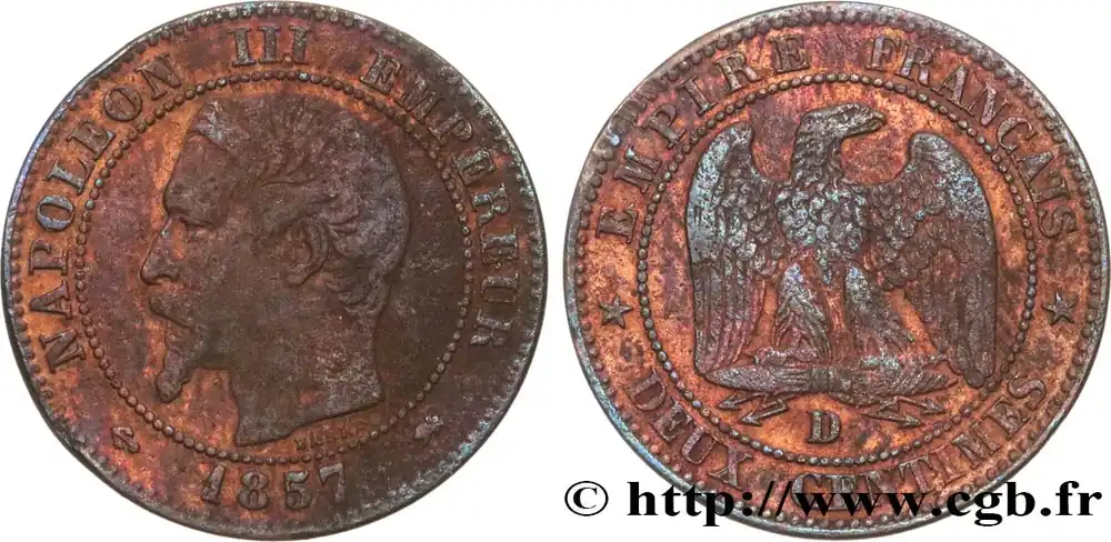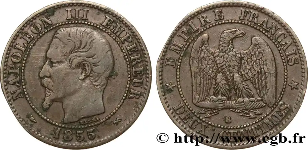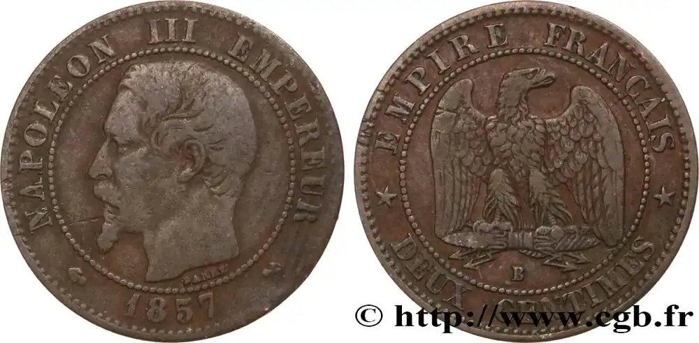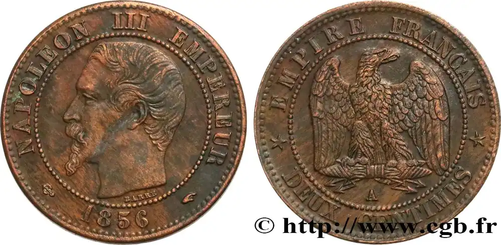 Type : Deux centimes Napoléon III, tête nueDate : 1856Nom de l’atelier/ville : RouenQuantité frappée : 4461561Métal : bronzeDiamètre : 20 mmAxe des coins : 6 h.Poids : 2,06 g.Tranche : lisseRéférence ouvrage :Classement FRANC 2023 / FRANC 2023 classificationF.107/39AversTitulature avers : (ANCRE) NAPOLEON III EMPEREUR (MM)// (MILLÉSIME).Description avers : Tête nue de Napoléon III à gauche ; signé BARRE au-dessous.ReversTitulature revers : EMPIRE FRANÇAIS// * DEUX CENTIMES *.Description revers : Aigle debout de face sur un foudre, les ailes ouvertes, la tête tournée à droite ; au-dessous, la lettre d’atelier.HistoriqueSECOND EMPIRE(02/12/1852-04/09/1870) Proclamé empereur sous le nom de Napoléon III, Louis Napoléon fait son entrée solennelle à Paris le 2 décembre 1852. Il épouse Eugénie Marie de Montijo, aristocrate espagnole, en janvier 1853. Son règne peut se diviser en trois périodes : l’Empire autoritaire jusqu’en 1860 ; l’Empire libéral de 1860 à 1870 puis l’Empire parlementaire en 1870. Durant l’Empire autoritaire, Napoléon III exerce son pouvoir sans partage, contrôle la presse tandis que les journaux pratiquent l’autocensure pour éviter leur suppression. Les préfets exercent une puissance illimitée dans les départements, les maires, les fonctionnaires sont nommés par le gouvernement. Comme sous le Premier Empire, l’Éducation et l’Université sont surveillées. Maintenant les grands principes de la révolution, la souveraineté du peuple est continuée grâce à la consultation par plébiscite. Sur le plan économique, l’essor est important, l’industrialisation se développe ainsi que les organismes de crédit et les grands magasins. Le prestige militaire est accru par la guerre de Crimée qui permet à la France de jouer un rôle international. L’attentat d’Orsini (janvier 1858) n’empêche nullement la France d’intervenir en Italie pour faire triompher le principe des nationalités et permet le rattachement de Nice et de la Savoie par le traité de Turin (mars 1860). Dès 1860, l’Empire évolue vers plus de libertés : traité libre-échangiste de commerce avec l’Angleterre, apparition d’une faible opposition dans le Corps législatif, octroi du droit de grève (1864), libéralisation de la presse (1868). Sur le plan international, la France acquiert la Nouvelle-Calédonie, la Cochinchine et encourage le creusement du canal de Suez par Ferdinand de Lesseps. Au Mexique, le soutien à Maximilien et à l’Autriche est toutefois un échec. Les élections de 1869 sont très mauvaises pour le régime et l’opposition obtient 45 % des voix. Le régime évolue alors vers un Empire parlementaire en appelant Émile Ollivier, chef du parti orléaniste et libéral, au pouvoir. Après Sadowa en 1866 où la Prusse écrase l’Autriche, l’affaire du trône d’Espagne et de la dépêche d’Ems entraînent la guerre qui est déclarée le 19 juillet 1870. Accumulant les revers, l’armée française est encerclée dans Metz puis Napoléon III, malade, capitule à Sedan le 2 septembre. Aussitôt la nouvelle connue, la déchéance de l’Empire est annoncée par Gambetta puis la République est proclamée le 4 septembre. Napoléon III est alors emmené en captivité en Hesse puis part dans le Kent où il meurt en 1873.