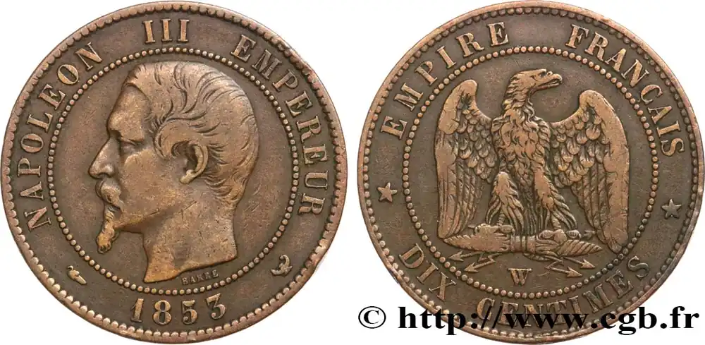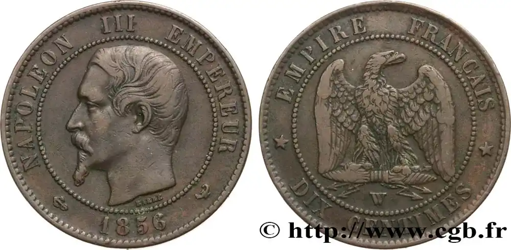 Type : Dix centimes Napoléon III, tête nueDate : 1855Nom de l’atelier/ville : RouenQuantité frappée : 2452948Métal : bronzeDiamètre : 30 mmAxe des coins : 6 h.Poids : 9,61 g.Tranche : lisseRéférence ouvrage :Classement FRANC 2023 / FRANC 2023 classificationF.133/21AversTitulature avers : NAPOLEON III EMPEREUR// (LEVRETTE) 1855 (MM).Description avers : Tête nue de Napoléon III à gauche ; signé BARRE au-dessous.ReversTitulature revers : EMPIRE FRANÇAIS// *DIX CENTIMES*.Description revers : Aigle debout de face sur un foudre, les ailes ouvertes, la tête tournée à droite ; au-dessous, B.CommentaireExemplaire avec le différent levrette.HistoriqueSECOND EMPIRE(02/12/1852-04/09/1870) Proclamé empereur sous le nom de Napoléon III, Louis Napoléon fait son entrée solennelle à Paris le 2 décembre 1852. Il épouse Eugénie Marie de Montijo, aristocrate espagnole, en janvier 1853. Son règne peut se diviser en trois périodes : l’Empire autoritaire jusqu’en 1860 ; l’Empire libéral de 1860 à 1870 puis l’Empire parlementaire en 1870. Durant l’Empire autoritaire, Napoléon III exerce son pouvoir sans partage, contrôle la presse tandis que les journaux pratiquent l’autocensure pour éviter leur suppression. Les préfets exercent une puissance illimitée dans les départements, les maires, les fonctionnaires sont nommés par le gouvernement. Comme sous le Premier Empire, l’Éducation et l’Université sont surveillées. Maintenant les grands principes de la révolution, la souveraineté du peuple est continuée grâce à la consultation par plébiscite. Sur le plan économique, l’essor est important, l’industrialisation se développe ainsi que les organismes de crédit et les grands magasins. Le prestige militaire est accru par la guerre de Crimée qui permet à la France de jouer un rôle international. L’attentat d’Orsini (janvier 1858) n’empêche nullement la France d’intervenir en Italie pour faire triompher le principe des nationalités et permet le rattachement de Nice et de la Savoie par le traité de Turin (mars 1860). Dès 1860, l’Empire évolue vers plus de libertés : traité libre-échangiste de commerce avec l’Angleterre, apparition d’une faible opposition dans le Corps législatif, octroi du droit de grève (1864), libéralisation de la presse (1868). Sur le plan international, la France acquiert la Nouvelle-Calédonie, la Cochinchine et encourage le creusement du canal de Suez par Ferdinand de Lesseps. Au Mexique, le soutien à Maximilien et à l’Autriche est toutefois un échec. Les élections de 1869 sont très mauvaises pour le régime et l’opposition obtient 45 % des voix. Le régime évolue alors vers un Empire parlementaire en appelant Émile Ollivier, chef du parti orléaniste et libéral, au pouvoir. Après Sadowa en 1866 où la Prusse écrase l’Autriche, l’affaire du trône d’Espagne et de la dépêche d’Ems entraînent la guerre qui est déclarée le 19 juillet 1870. Accumulant les revers, l’armée française est encerclée dans Metz puis Napoléon III, malade, capitule à Sedan le 2 septembre. Aussitôt la nouvelle connue, la déchéance de l’Empire est annoncée par Gambetta puis la République est proclamée le 4 septembre. Napoléon III est alors emmené en captivité en Hesse puis part dans le Kent où il meurt en 1873.