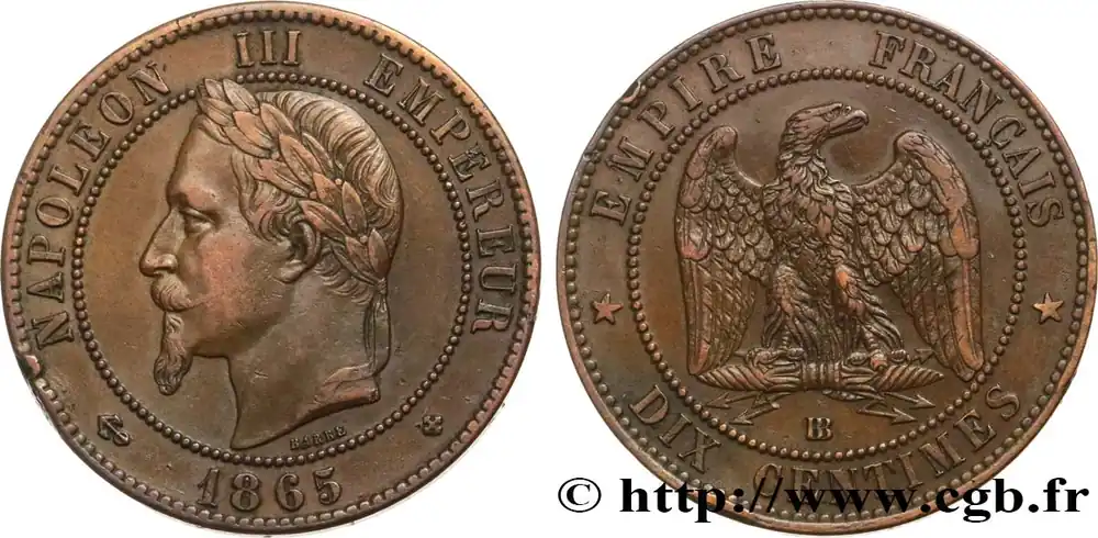 Type : Dix Centimes Napoléon tête lauréeDate : 1865Nom de l’atelier/ville : StrasbourgQuantité frappée : 4796851Métal : bronzeDiamètre : 30 mmAxe des coins : 6 h.Poids : 9,89 g.Tranche : lisseCommentaires sur l’état de conservation :Exemplaire très légèrement voiléRéférence ouvrage :Classement FRANC 2023 / FRANC 2023 classificationF.134/17AversTitulature avers : NAPOLEON III – EMPEREUR// 1865.Description avers : Tête laurée de Napoléon III à gauche ; signé BARRE au-dessous.ReversTitulature revers : EMPIRE – FRANÇAIS// * DIX CENTIMES *.Description revers : Aigle debout sur un foudre, les ailes ouvertes, la tête tournée à droite ; au-dessous BB.HistoriqueSECOND EMPIRE(02/12/1852-04/09/1870) Proclamé empereur sous le nom de Napoléon III, Louis Napoléon fait son entrée solennelle à Paris le 2 décembre 1852. Il épouse Eugénie Marie de Montijo, aristocrate espagnole, en janvier 1853. Son règne peut se diviser en trois périodes : l’Empire autoritaire jusqu’en 1860 ; l’Empire libéral de 1860 à 1870 puis l’Empire parlementaire en 1870. Durant l’Empire autoritaire, Napoléon III exerce son pouvoir sans partage, contrôle la presse tandis que les journaux pratiquent l’autocensure pour éviter leur suppression. Les préfets exercent une puissance illimitée dans les départements, les maires, les fonctionnaires sont nommés par le gouvernement. Comme sous le Premier Empire, l’Éducation et l’Université sont surveillées. Maintenant les grands principes de la révolution, la souveraineté du peuple est continuée grâce à la consultation par plébiscite. Sur le plan économique, l’essor est important, l’industrialisation se développe ainsi que les organismes de crédit et les grands magasins. Le prestige militaire est accru par la guerre de Crimée qui permet à la France de jouer un rôle international. L’attentat d’Orsini (janvier 1858) n’empêche nullement la France d’intervenir en Italie pour faire triompher le principe des nationalités et permet le rattachement de Nice et de la Savoie par le traité de Turin (mars 1860). Dès 1860, l’Empire évolue vers plus de libertés : traité libre-échangiste de commerce avec l’Angleterre, apparition d’une faible opposition dans le Corps législatif, octroi du droit de grève (1864), libéralisation de la presse (1868). Sur le plan international, la France acquiert la Nouvelle-Calédonie, la Cochinchine et encourage le creusement du canal de Suez par Ferdinand de Lesseps. Au Mexique, le soutien à Maximilien et à l’Autriche est toutefois un échec. Les élections de 1869 sont très mauvaises pour le régime et l’opposition obtient 45 % des voix. Le régime évolue alors vers un Empire parlementaire en appelant Émile Ollivier, chef du parti orléaniste et libéral, au pouvoir. Après Sadowa en 1866 où la Prusse écrase l’Autriche, l’affaire du trône d’Espagne et de la dépêche d’Ems entraînent la guerre qui est déclarée le 19 juillet 1870. Accumulant les revers, l’armée française est encerclée dans Metz puis Napoléon III, malade, capitule à Sedan le 2 septembre. Aussitôt la nouvelle connue, la déchéance de l’Empire est annoncée par Gambetta puis la République est proclamée le 4 septembre. Napoléon III est alors emmené en captivité en Hesse puis part dans le Kent où il meurt en 1873.
