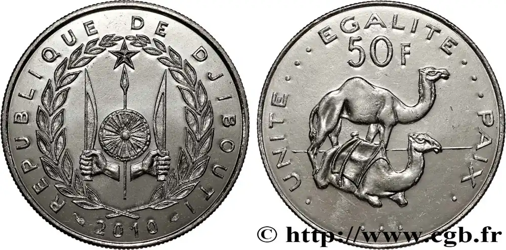 Type : 50 Francs dromadairesDate : 2010Nom de l’atelier/ville : ParisQuantité frappée : -Métal : cupro-nickelDiamètre : 25 mmAxe des coins : 6 h.Poids : 6,90 g.Tranche : striéeRéférence ouvrage :KM21/25 AversTitulature avers : REPUBLIQUE DE DJIBOUTI / 2010.Description avers : emblème de la République de Djibouti.ReversTitulature revers : UNITE · · · EGALITE · · · PAIX · / 50 F.Description revers : dromadaires.HistoriqueDJIBOUTI(1977-) La République de Djibouti correspond à l’ancien territoire colonial français constitué autour du golfe de Tadjourah dans la corne de l’Afrique. Le territoire d’Obock et dépendances est constitué par la France en 1862. En 1896, le territoire est rebaptisé Côte française des Somalis puis en 1967 Territoire français des Afars et des Issas. En 1977, l’indépendance est proclamée.