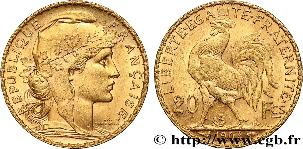 Type : 20 francs or Coq, Dieu protège la FranceDate : 1904Nom de l’atelier/ville : ParisQuantité frappée : 7705674Métal : orTitre en millième : 900 ‰Diamètre : 21 mmAxe des coins : 6 h.Poids : 6,45 g.Tranche : inscrite en relief +* DIEU *+ +* PROTEGE *+ +* LA FRANCE *+Référence ouvrage :Classement FRANC 2023 / FRANC 2023 classificationF.534/9AversTitulature avers : REPUBLIQUE – FRANÇAISE..Description avers : Buste de Marianne drapée à droite, coiffée du bonnet phrygien décoré d’une branche de chêne ; signé J.C. CHAPLAIN devant le cou.ReversTitulature revers : LIBERTE EGALITE FRATERNITE// 20 – FCS// 1904.Description revers : Coq passant à gauche, date à l’exergue.CommentaireFabrication du 20 janvier au 28 décembre pour un total de 7.705.674 exemplaires en 823 délivrances dont une refonte.HistoriqueOR, PALLADIUM ET PLATINE INVESTISSEMENTSécurisez et diversifiez votre épargne avec les métaux précieux :Dans un contexte d’instabilité politique et économique croissante, diversifier son épargne peut être une démarche judicieuse. Les métaux précieux comme l’or, le palladium et le platine constituent des actifs tangibles souvent prisés en raison de leur caractère intemporel et de leur résilience face aux fluctuations des marchés.Pour répondre à des besoins variés, l’achat de pièces officielles en or, palladium ou platine est une option flexible et adaptée. Ces pièces, disponibles à l’unité ou en lot, permettent à chacun d’ajuster ses choix selon ses objectifs et son budget, sans engagement à long terme.Un processus simple et sécurisé :Nous proposons une livraison sécurisée et garantie. Les paiements peuvent être effectués par carte bancaire ou par virement, bien que certaines transactions puissent nécessiter un règlement exclusivement par virement bancaire. Une pièce d’identité valide (carte nationale d’identité ou passeport) sera demandée pour finaliser votre achat.Stockage en toute sécurité et confidentialité :Le département Investissement de CGB Numismatique Paris met à votre disposition des solutions de stockage offrant une sécurité renforcée et une confidentialité optimale pour vos achats en or, palladium et platine.Contactez-nous pour plus d’informations :Pour toute question ou pour passer commande, prenez contact avec notre responsable des achats/ventes de métaux précieux : par email à [email protected] ou par téléphone. Nous mettons à votre disposition des informations générales et des services pour vous accompagner dans vos projets d’investissement.CGB Numismatique Paris agit en tant que fournisseur de métaux précieux et ne fournit aucun conseil en investissement. La valeur des métaux précieux peut fluctuer, et les performances passées ne garantissent pas les résultats futurs. L’achat de métaux précieux doit être considéré comme une stratégie de préservation de valeur plutôt qu’un investissement spéculatif. Conformément à l’article L.221-28 du Code de la consommation, le droit de rétractation ne s’applique pas aux achats d’or d’investissement, dont le prix dépend des fluctuations des marchés financiers.
