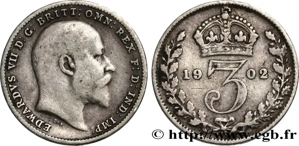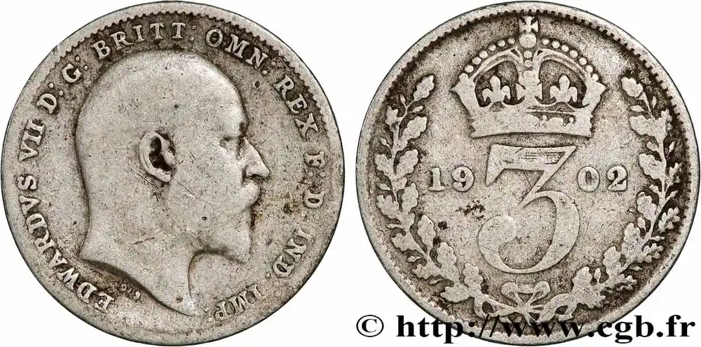Type : 3 Pence Edouard VIIDate : 1904Quantité frappée : 3627360Métal : argentTitre en millième : 925 ‰Diamètre : 16, mmAxe des coins : 12 h.Poids : 1,38 g.Tranche : lisseCommentaires sur l’état de conservation :Patine tachéeRéférence ouvrage :Sp.3987 – KM20/3984 AversTitulature avers : EDWARDVS VII D:G: BRITT: OMN: REX REGINA·F:D: IND: IMP:.Description avers : buste à droite du roi Édouard VII.ReversTitulature revers : 19 – 04 // 3.Description revers : couronne de chêne et couronne.HistoriqueROYAUME-UNI