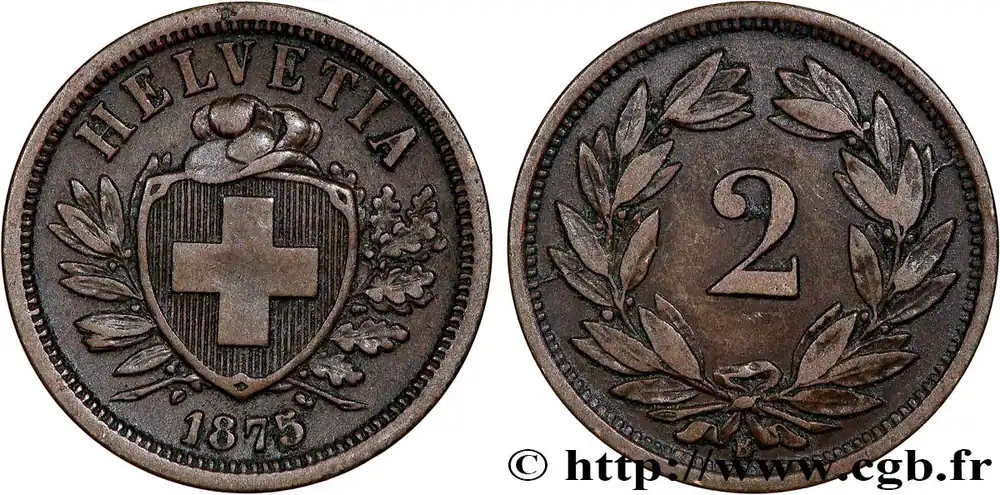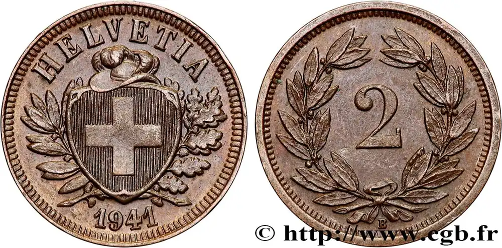 Type : 2 Centimes (Rappen) croix suisseDate : 1930Nom de l’atelier/ville : Berne – BQuantité frappée : 1000000Métal : bronzeDiamètre : 20 mmAxe des coins : 12 h.Poids : 2,49 g.Tranche : lisseRéférence ouvrage :KM20/4.1 AversTitulature avers : HELVETIA // 1937.Description avers : écu surmonté d’un chapeau entre un rameau d’olivier un rameau de chêne.ReversTitulature revers : 2 // B.Description revers : couronne de laurier.HistoriqueSUISSE