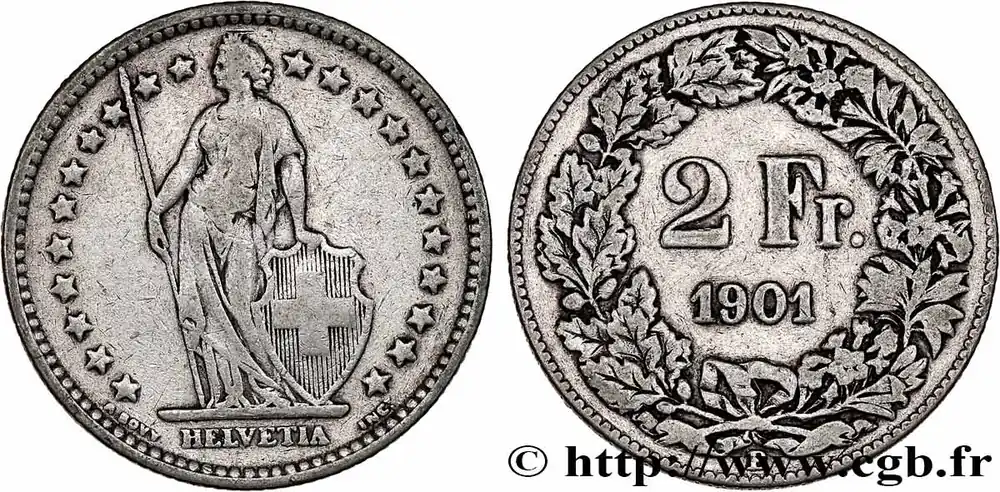 Type : 2 Francs HelvetiaDate : 1943Nom de l’atelier/ville : BerneQuantité frappée : 2089000Métal : argentTitre en millième : 835 ‰Diamètre : 27,2 mmAxe des coins : 6 h.Poids : 9,94 g.Tranche : canneléeRéférence ouvrage :KM20/21 AversTitulature avers : HELVETIA.Description avers : Helvetia debout tenant une lance et un bouclier, étoiles.ReversDescription revers : dans une couronne composite, inscriptions 2 Fr. et date.HistoriqueSUISSE