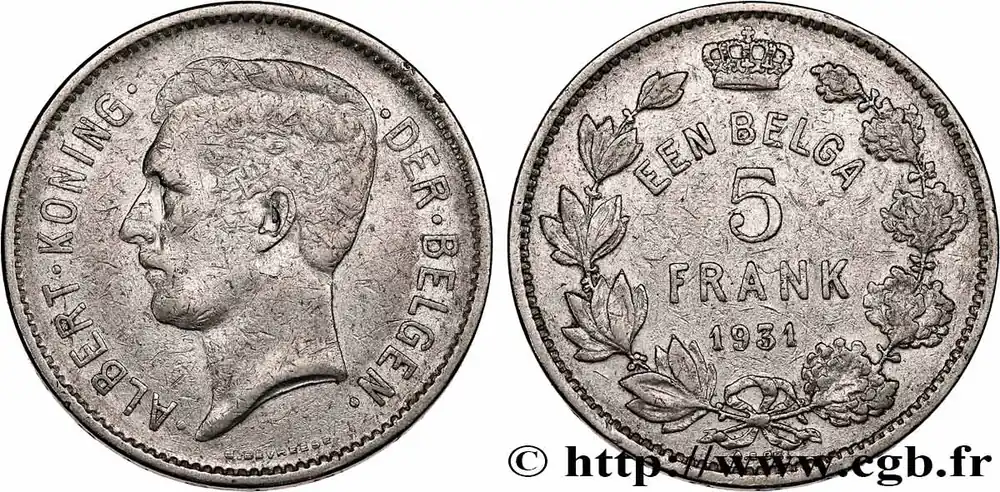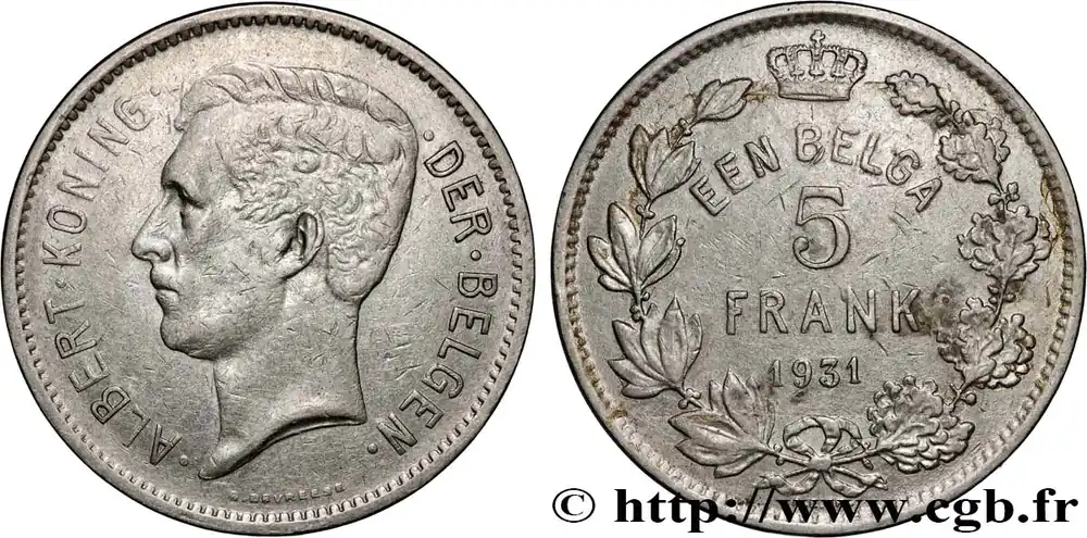 Type : 5 Frank – 1 Belga Albert Ier légende FlamandeDate : 1932Quantité frappée : 5086000Métal : nickelDiamètre : 31 mmAxe des coins : 6 h.Poids : 13,87 g.Tranche : inscrite en creux * BELGIE * * BELGIQUE *Référence ouvrage :KM20/98 AversTitulature avers : ·ALBERT·KONING· ·DER·BELGEN· // G. DEVREESE.Description avers : portrait à gauche du roi Albert Ier.Traduction avers : ·ALBERT·ROI· ·DES·BELGES·.ReversTitulature revers : EIN BELGA / 5 / FRANK / 1932 // A.E.GR.Description revers : armes du Royaume de Belgique.Traduction revers : UN BELGA / 5 / FRANCS / 1932.HistoriqueBELGIQUE