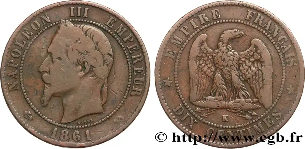 Type : Dix centimes Napoléon III, tête lauréeDate : 1864Nom de l’atelier/ville : ParisQuantité frappée : 1556490Métal : bronzeDiamètre : 30 mmAxe des coins : 6 h.Poids : 9,67 g.Tranche : lisseDegré de rareté : R1Commentaires sur l’état de conservation :Exemplaire nettoyéRéférence ouvrage :Classement FRANC 2023 / FRANC 2023 classificationF.134/13AversTitulature avers : NAPOLEON III EMPEREUR// (ANCRE) 1864 (MM).Description avers : Tête laurée de Napoléon III à gauche ; signé BARRE au-dessous.ReversTitulature revers : EMPIRE FRANÇAIS// * DIX CENTIMES *.Description revers : Aigle debout sur un foudre, les ailes ouvertes, la tête tournée à droite ; au-dessous A.HistoriqueSECOND EMPIRE(02/12/1852-04/09/1870) Proclamé empereur sous le nom de Napoléon III, Louis Napoléon fait son entrée solennelle à Paris le 2 décembre 1852. Il épouse Eugénie Marie de Montijo, aristocrate espagnole, en janvier 1853. Son règne peut se diviser en trois périodes : l’Empire autoritaire jusqu’en 1860 ; l’Empire libéral de 1860 à 1870 puis l’Empire parlementaire en 1870. Durant l’Empire autoritaire, Napoléon III exerce son pouvoir sans partage, contrôle la presse tandis que les journaux pratiquent l’autocensure pour éviter leur suppression. Les préfets exercent une puissance illimitée dans les départements, les maires, les fonctionnaires sont nommés par le gouvernement. Comme sous le Premier Empire, l’Éducation et l’Université sont surveillées. Maintenant les grands principes de la révolution, la souveraineté du peuple est continuée grâce à la consultation par plébiscite. Sur le plan économique, l’essor est important, l’industrialisation se développe ainsi que les organismes de crédit et les grands magasins. Le prestige militaire est accru par la guerre de Crimée qui permet à la France de jouer un rôle international. L’attentat d’Orsini (janvier 1858) n’empêche nullement la France d’intervenir en Italie pour faire triompher le principe des nationalités et permet le rattachement de Nice et de la Savoie par le traité de Turin (mars 1860). Dès 1860, l’Empire évolue vers plus de libertés : traité libre-échangiste de commerce avec l’Angleterre, apparition d’une faible opposition dans le Corps législatif, octroi du droit de grève (1864), libéralisation de la presse (1868). Sur le plan international, la France acquiert la Nouvelle-Calédonie, la Cochinchine et encourage le creusement du canal de Suez par Ferdinand de Lesseps. Au Mexique, le soutien à Maximilien et à l’Autriche est toutefois un échec. Les élections de 1869 sont très mauvaises pour le régime et l’opposition obtient 45 % des voix. Le régime évolue alors vers un Empire parlementaire en appelant Émile Ollivier, chef du parti orléaniste et libéral, au pouvoir. Après Sadowa en 1866 où la Prusse écrase l’Autriche, l’affaire du trône d’Espagne et de la dépêche d’Ems entraînent la guerre qui est déclarée le 19 juillet 1870. Accumulant les revers, l’armée française est encerclée dans Metz puis Napoléon III, malade, capitule à Sedan le 2 septembre. Aussitôt la nouvelle connue, la déchéance de l’Empire est annoncée par Gambetta puis la République est proclamée le 4 septembre. Napoléon III est alors emmené en captivité en Hesse puis part dans le Kent où il meurt en 1873.