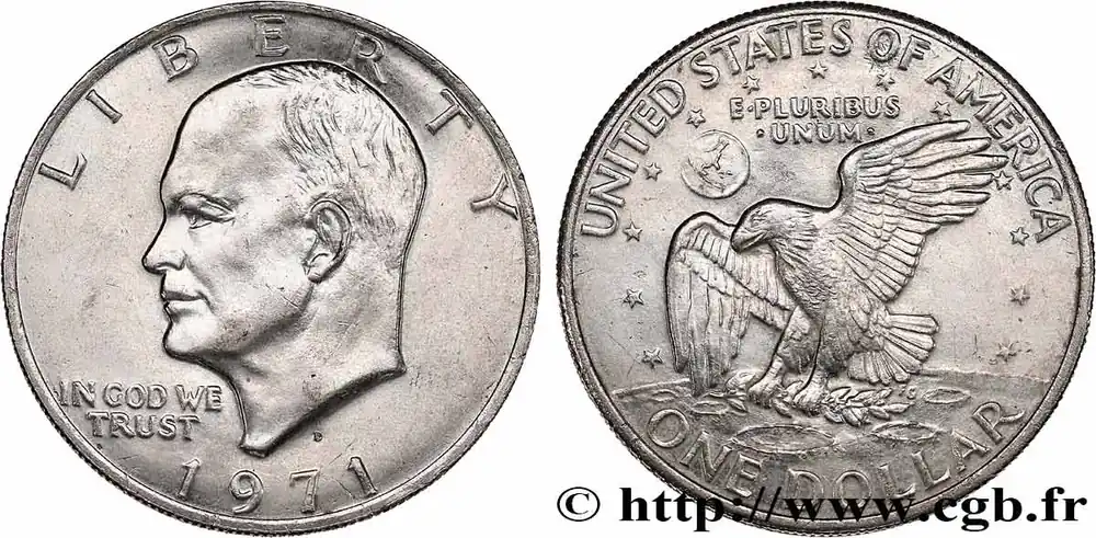 Type : 1 Dollar EisenhowerDate : 1972Nom de l’atelier/ville : PhiladelphieQuantité frappée : 75890000Métal : cupro-nickelDiamètre : 38,1 mmAxe des coins : 6 h.Poids : 22,67 g.Tranche : canneléeRéférence ouvrage :KM20/503 – Y.- AversTitulature avers : LIBERTY // (DATE).Description avers : portrait à gauche de Dwight David Eisenhower et inscription à gauche dans le champ : IN GOD WE / TRUST.ReversTitulature revers : UNITED STATES OF AMERICA // ONE DOLLAR.Description revers : aigle aux ailes déployées tenant un rameau d’olivier ; au second plan sol lunaire et vue de la terre ; inscription en haut dans le champ : E.PLURIBUS / UNUM.HistoriqueÉTATS-UNIS D’AMÉRIQUE
