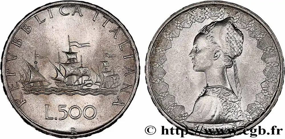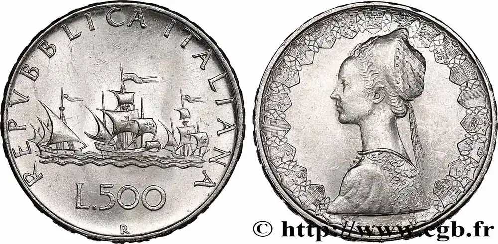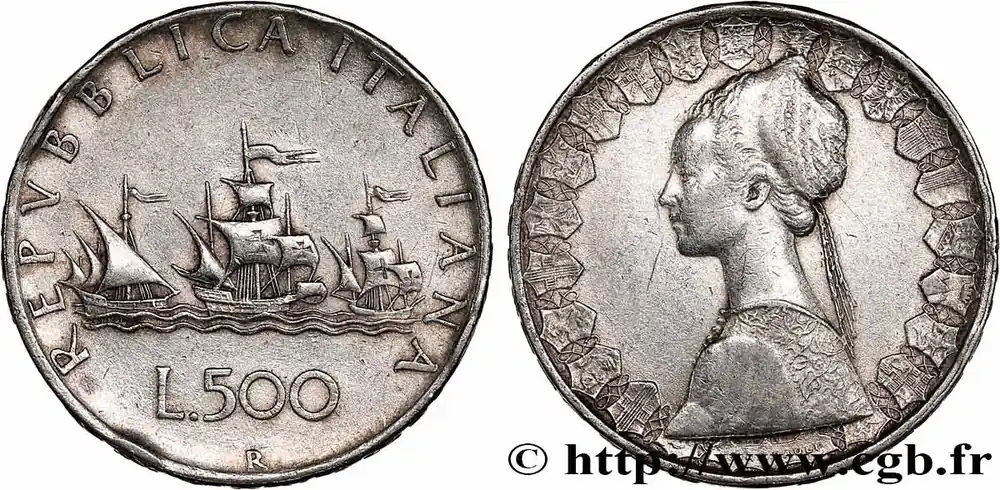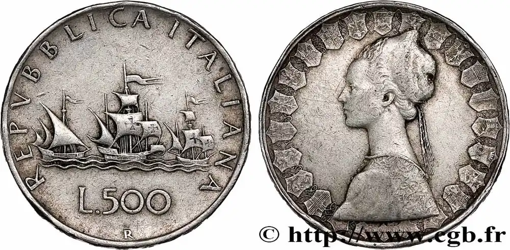 Type : 500 Lire “caravelles”Date : 1958Nom de l’atelier/ville : RomeQuantité frappée : 24240000Métal : argentTitre en millième : 835 ‰Diamètre : 29 mmAxe des coins : 6 h.Poids : 11,02 g.Tranche : en relief REPVBBLICA ITALIANA ***1958***Référence ouvrage :Mont.02  – KM20/98 AversTitulature avers : REPVBBLICA ITALIANA // VEROI // L.500 / R.Description avers : trois caravelles bannières au vent.Traduction avers : (République Italienne).ReversTitulature revers : GIAMPAOLI.Description revers : femme en habit de la renaissance / écu des villes ou provinces : Gênes, Turin, Aoste, Milan, Trente, Venese, Trieste et Udine, Bologne, Florence, Ancône, Perouse, Rome, L’Aquilée, Naples, Bari, Potenza, Catanzaro, Sicile et Cagliari.HistoriqueITALIE