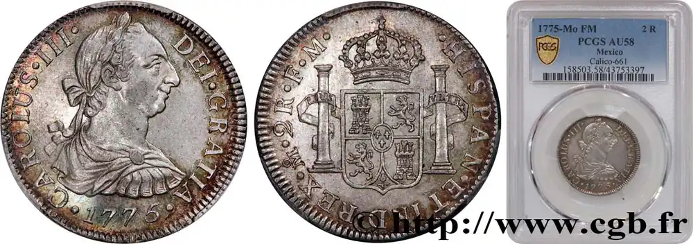 Type : 2 Reales Date : 1788Nom de l’atelier/ville : MadridQuantité frappée : -Métal : argentTitre en millième : 813 ‰Diamètre : 25 mmAxe des coins : 12 h.Poids : 5,66 g.Tranche : décoréeRéférence ouvrage :Cal.254 – KM18/412 AversTitulature avers : CAROLUS – III. DEI. G. 1788..Description avers : Buste à droite de Charles III.Traduction avers : (Charles III, par la grâce de Dieu).ReversTitulature revers : HISPANIARUM. REX. 2 MF.Description revers : Écu couronné aux armes de l’Espagne.HistoriqueESPAGNE – ROYAUME D’ESPAGNE – CHARLES III(10/08/1759-14/12/1788) Charles III (20/01/1716-14/12/1788) est le fils aîné du second mariage de Philippe V, celui avec Élisabeth Farnèse. Il fut successivement duc de Parme (1731-1735) et roi de Naples (1735-1759) puis il succéda à son demi-frère, Ferdinand VI, comme roi d’Espagne en 1759. Il épousa Marie-Amélie de Saxe en 1738 qui lui donna six enfants. Son fils Charles IV lui succéda en 1788 comme roi d’Espagne et son autre fils Ferdinand IV comme roi de Naples et des Deux Siciles (1759-1825).