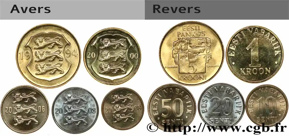 Type : Lot de 5 monnaies10, 20 & 50 Senti, 1 Kroon, 5 KrooniDate : 1994-2008Nom de l’atelier/ville : TallinnAxe des coins : 12 h.Tranche : lisseRéférence ouvrage :KM20/22-24a-24-35-30 AversTitulature avers : (DATE).Description avers : Écu au trois lions.ReversTitulature revers : EESTI / PANK 75 // 5 / KROONI.Description revers : Logo.CommentaireLot comprenant 5 monnaies d’Estonie – 10 Senti 2008 Cupro-aluminium-nickel,• 1,87 g, ⌀ 17,2 mm, KM# 22- 20 Senti 2008 Acier plaqué nickel , 2,27 g, ⌀ 18,95 mm, KM# 23- 50 Senti 2006 Cupro-aluminium-nickel , 2,99 g, ⌀ 19,5 mm, KM# 24- 1 Kroon 2000 Cupro-aluminium, 5 g, ⌀ 23,25 mm, KM# 35- 5 Krooni 1994 Cupro-aluminium, 7,1 g, ⌀ 26,10 mm, KM# 30.HistoriqueESTONIE