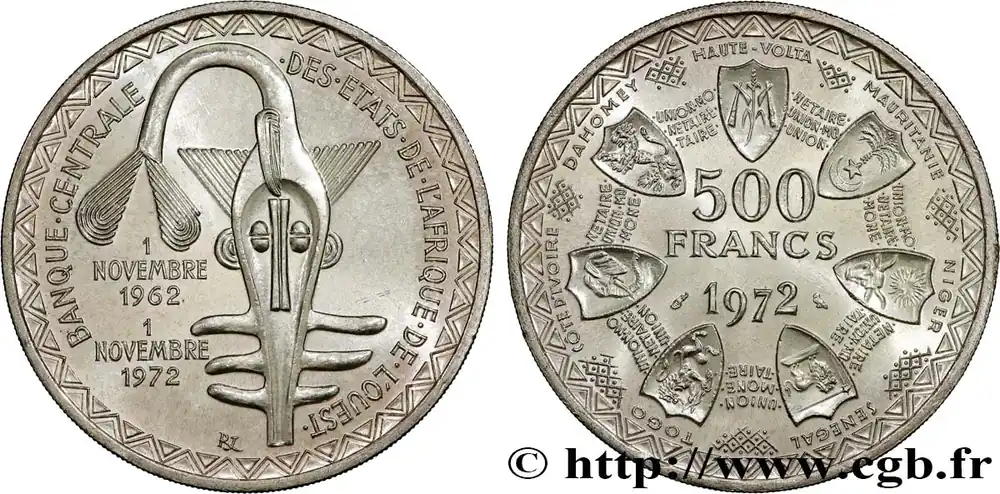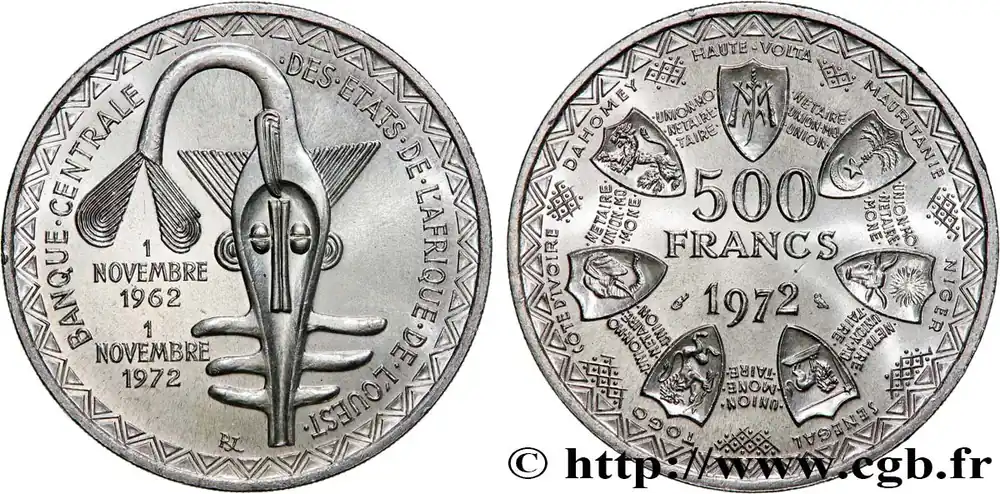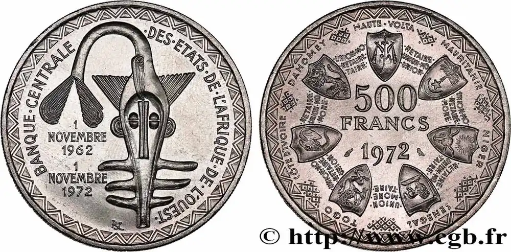 Type : 500 Francs BCEAODate : 1972Nom de l’atelier/ville : ParisQuantité frappée : 100000Métal : argentTitre en millième : 900 ‰Diamètre : 37 mmAxe des coins : 6 h.Poids : 25 g.Tranche : striéeRéférence ouvrage :KM20/7 AversTitulature avers : BANQUE . CENTRALE . DES . ÉTATS . DE . L’AFRIQUE . DE . L’OUEST. // 1/NOVEMBRE/1962 // 1/NOVEMBRE/1972.Description avers : logo de la BCEAO.ReversTitulature revers : HAUTE – VOLTA/ MAURITANIE / NIGER / SENEGAL / TOGO / COTE D’IVOIRE / DAHOMEY /SOUS UNE FRISE ET AUTOUR D’UN COLLIER DE BLASON LIÉS PAR LA LÉGENDE RÉPÉTÉE UNION MONÉTAIRE OUEST-AFRICAINE / 500 / FRANCS / 1972.Description revers : Collier de blasons.HistoriqueÉTATS DE L’AFRIQUE DE L’OUEST (BCEAO)(1956-) La Banque centrale des États de l’Afrique de l’Ouest (BCEAO) est la principale institution monétaire de l’Union économique et monétaire ouest-africaine (UEMOA) qui comprend le Bénin, le Burlina-Faso, la Côte d’Ivoire, le Mali, le Niger, le Sénégal et le Togo. Son siège est situé à Dakar. Elle fait suite à l’Institut d’émission de l’Afrique-Occidentale française et du Togo. La Banque de France garantit la convertibilité du Franc CFA en Franc français puis à partir de 1999 en Euro.