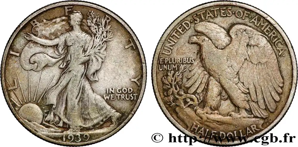 Type : 1/2 Dollar Walking LibertyDate : 1940Nom de l’atelier/ville : PhiladelphieQuantité frappée : 9167279Métal : argentTitre en millième : 900 ‰Diamètre : 30,6 mmAxe des coins : 6 h.Poids : 12,40 g.Tranche : canneléeRéférence ouvrage :KM20/142  – Y.- AversTitulature avers : LIBERTY // (DATE).Description avers : Liberté marchant à gauche, soleil levant ; IN GOD / WE TRUST dans le champ.Traduction avers : (Liberté).ReversTitulature revers : UNITED STATES OF AMERICA // HALF DOLLAR.Description revers : aigle aux ailes déployées ; E.PLURIBUS / UNUM dans le champ à gauche.Traduction revers : (États-Unis d’Amérique // demi-dollar).HistoriqueÉTATS-UNIS D’AMÉRIQUE