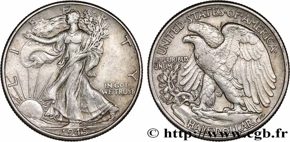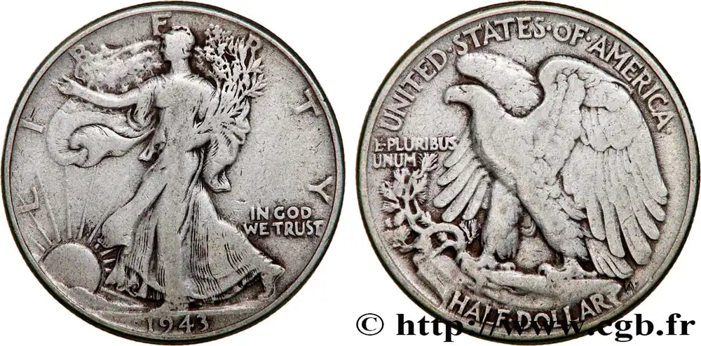Type : 1/2 Dollar Walking LibertyDate : 1943Nom de l’atelier/ville : DenverQuantité frappée : 11346000Métal : argentTitre en millième : 900 ‰Diamètre : 30,6 mmAxe des coins : 6 h.Poids : 12,5 g.Tranche : canneléeCommentaires sur l’état de conservation :monnaie nettoyée et coups sur trancheRéférence ouvrage :KM20/142 – Y.- AversTitulature avers : LIBERTY // (DATE).Description avers : Liberté marchant à gauche, soleil levant ; IN GOD / WE TRUST dans le champ.Traduction avers : (Liberté).ReversTitulature revers : UNITED STATES OF AMERICA // HALF DOLLAR.Description revers : Aigle aux ailes déployées ; E.PLURIBUS / UNUM dans le champ à gauche.Traduction revers : (États-Unis d’Amérique // demi-dollar).HistoriqueÉTATS-UNIS D’AMÉRIQUE