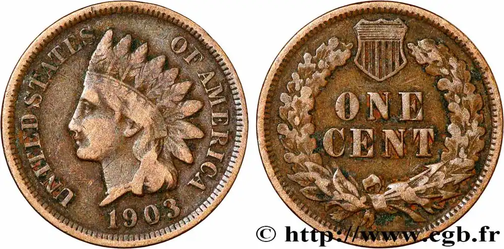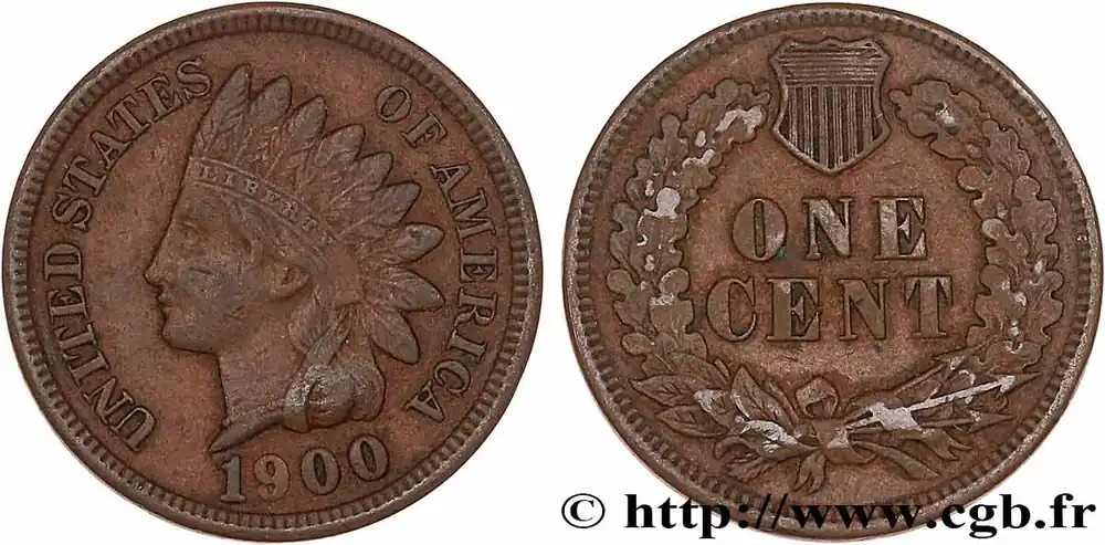 Type : 1 Cent tête d’indien, 3e typeDate : 1901Nom de l’atelier/ville : PhiladelphieQuantité frappée : 79609158Métal : cuivreDiamètre : 19 mmAxe des coins : 6 h.Poids : 3,08 g.Tranche : lisseRéférence ouvrage :KM20/90a – Y.- AversTitulature avers : UNITED STATES OF AMERICA / 1901.Description avers : “tête d’indien” à gauche.Traduction avers : (États-Unis d’Amérique).ReversDescription revers : Au centre en deux lignes : ONE/ CENT dans une couronne de rameaux de feuilles de chêne, écu.CommentaireSuite aux problème de frappe du Cent “Flying Eagle”, un nouveau type est dessiné par le graveur en chef, James Barton Longacre,le cent tête d’indien (Indian Head). En fait, il s’agit de la Liberté coiffé d’une parure indienne. Ce type est frappé de 1859 à 1909. En 1859, le type ne possède pas d’écu au revers. A partir de 1860, le revers est modifié par le remplacement de la couronne de laurier par une couronne de chêne et l’ajout d’un écu.HistoriqueÉTATS-UNIS D’AMÉRIQUE