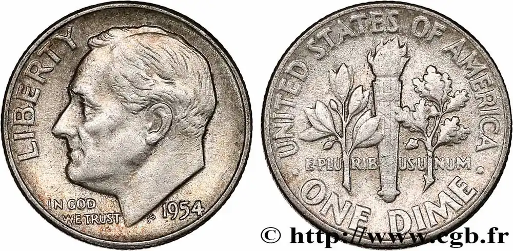Type : 1 Dime (10 Cents) RooseveltDate : 1948Nom de l’atelier/ville : DenverQuantité frappée : 52800000Métal : argentTitre en millième : 900 ‰Diamètre : 17,9 mmAxe des coins : 6 h.Poids : 2,51 g.Tranche : striéeRéférence ouvrage :KM20/195  – Y.- AversTitulature avers : LIBERTY // IN GOD / WE TRUST // 1948.Description avers : portrait à gauche du président Franklin Delano Roosevelt.ReversTitulature revers : UNITED STATES OF AMERICA // . ONE DIME . // E.PLURIBUS.UNUM // D.Description revers : torche avec à gauche un rameau d’olivier et à droite un rameau de chêne.HistoriqueÉTATS-UNIS D’AMÉRIQUE