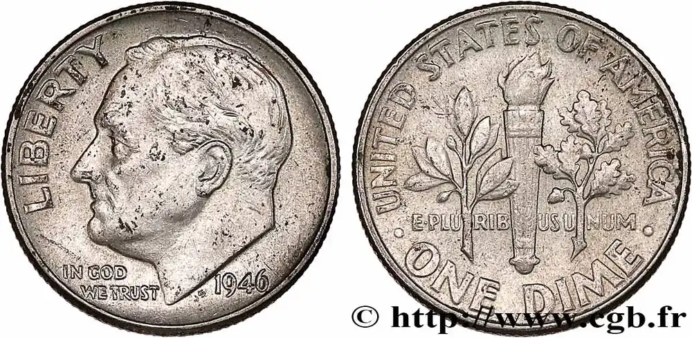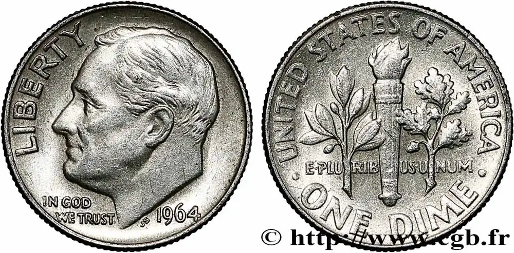 Type : 1 Dime (10 Cents) RooseveltDate : 1953Nom de l’atelier/ville : DenverQuantité frappée : 136400000Métal : argentTitre en millième : 900 ‰Diamètre : 17,9 mmAxe des coins : 6 h.Poids : 2,47 g.Tranche : striéeRéférence ouvrage :KM20/195 – Y.- AversTitulature avers : LIBERTY // IN GOD / WE TRUST // 1953.Description avers : portrait à gauche du président Franklin Delano Roosevelt.ReversTitulature revers : UNITED STATES OF AMERICA // . ONE DIME . // E.PLURIBUS.UNUM // D.Description revers : torche avec à gauche un rameau d’olivier et à droite un rameau de chêne.HistoriqueÉTATS-UNIS D’AMÉRIQUE