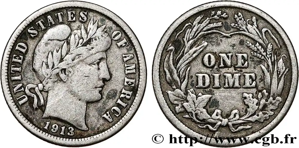 Type : 1 Dime BarberDate : 1908Nom de l’atelier/ville : PhiladelphieQuantité frappée : 10600000Métal : argentTitre en millième : 900 ‰Diamètre : 17,9 mmAxe des coins : 6 h.Poids : 2,30 g.Tranche : canneléeCommentaires sur l’état de conservation :Monnaie trouée à 12 heures au droitRéférence ouvrage :KM20/113 – Y.- AversTitulature avers : UNITED STATES OF AMERICA // 1908.Description avers : Tête de la Liberté à droite.ReversTitulature revers : ONE / DIME.Description revers : En deux lignes dans une couronne végétale.HistoriqueÉTATS-UNIS D’AMÉRIQUE