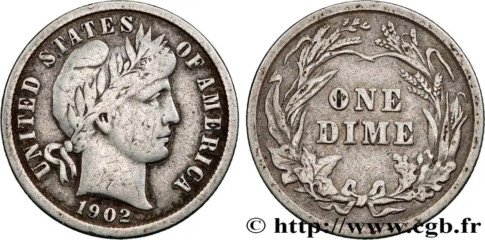 Type : 1 Dime BarberDate : 1913Nom de l’atelier/ville : PhiladelphieQuantité frappée : 19760000Métal : argentTitre en millième : 900 ‰Diamètre : 17,9 mmAxe des coins : 6 h.Poids : 2,36 g.Tranche : canneléeCommentaires sur l’état de conservation :Traces de nettoyageRéférence ouvrage :KM20/113  – Y.- AversTitulature avers : UNITED STATES OF AMERICA // 1913.Description avers : Tête de la Liberté à droite.ReversTitulature revers : ONE / DIME.Description revers : En deux lignes dans une couronne végétale.HistoriqueÉTATS-UNIS D’AMÉRIQUE