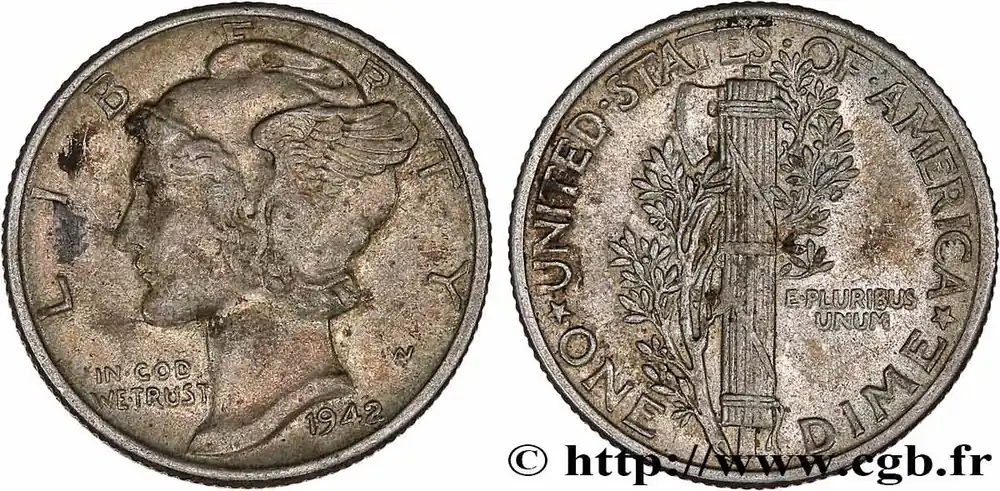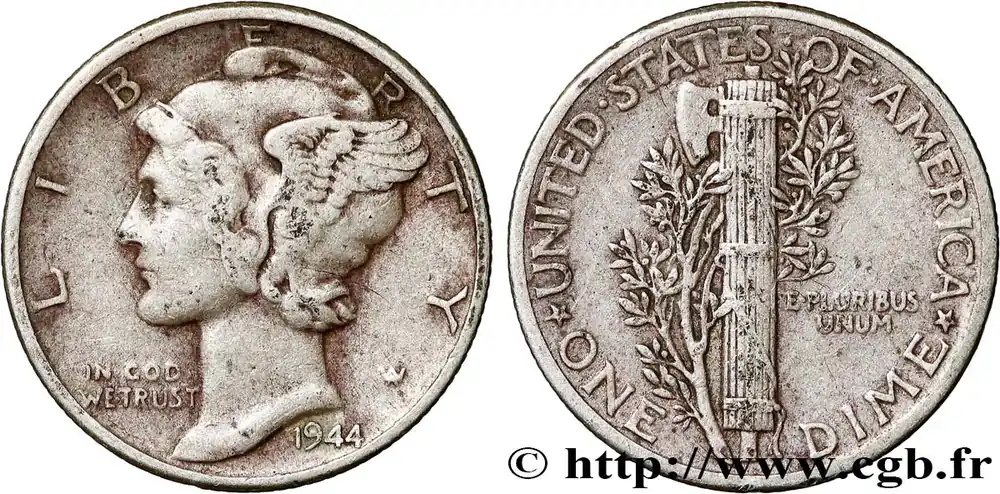 Type : 1 Dime MercuryDate : 1943Nom de l’atelier/ville : PhiladelphieQuantité frappée : 191710000Métal : argentTitre en millième : 900 ‰Diamètre : 17,9 mmAxe des coins : 6 h.Poids : 2,48 g.Tranche : canneléeRéférence ouvrage :KM20/140 – Y.- AversTitulature avers : LIBERTY // IN GOD / WE TRUST // (DATE).Description avers : Tête casquée de Mercure à gauche.ReversTitulature revers : UNITED. STATES. OF. AMERICA. ONE – DIME.Description revers : Faisceau / E. PLURIBUS. UNUM.HistoriqueÉTATS-UNIS D’AMÉRIQUE