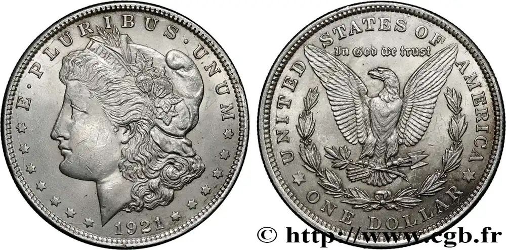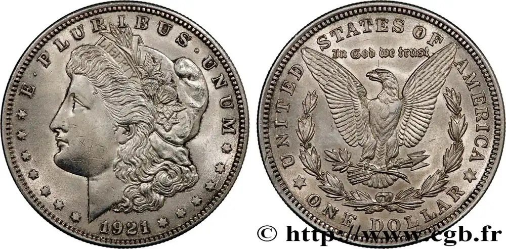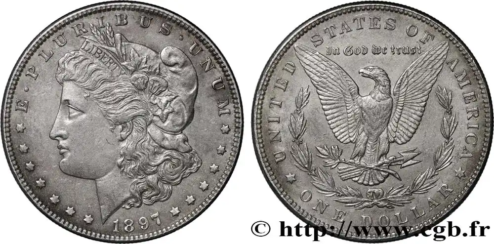 Type : 1 Dollar MorganDate : 1884Nom de l’atelier/ville : Nouvelle-OrléansQuantité frappée : 9730000Métal : argentTitre en millième : 900 ‰Diamètre : 38,10 mmAxe des coins : 6 h.Poids : 26,74 g.Tranche : canneléeRéférence ouvrage :KM.19/110 – Y.- AversTitulature avers : E . PLURIBUS . UNUM // (DATE).Description avers : Tête à gauche de femme symbolisant la Liberté.Traduction avers : (De plusieurs, un).ReversTitulature revers : UNITED – STATES OF – AMERICA // * ONE DOLLAR *.Description revers : Aigle aux ailles déployées tenant une branche d’olivier et deux flèches ; couronne de laurier et motto “In God we trust”.Traduction revers : (États-Unis d’Amérique // un dollar).CommentaireEn 1873, le « Fourth Coinage act » met fin au bimétallisme et les monnaies en argent sont démonétisées. Cependant dès 1876, de nombreux projets de lois sont proposés afin de réintroduire des dollars en argent. En 1878, Rutherford B. Hayes tente en vain de faire véto au «Bland-Allison Act » au Congrès. Dans cette optique, dès 1876, Henry Linderman, directeur de l’US Mint demande alors à C.W. Fremantle, deputy master de la Royal Mint de Londres, de lui trouver un graveur de coin de premier rang. Ce sera Georges T. Morgan (1845-1925) qui devient assistant graveur auprès du graveur en chef William Barber. Dès 1877, Morgan travaille sur des essais monétaires et prépare son projet de dollar argent. Ainsi en 1878, seulement une semaine après le passage de la loi, l’atelier de Philadelphie frappe des dollars dits « Morgan ». Georges T. Morgan Morgan succèdera à Charles E. Barber (fils de William Barber) en 1917.HistoriqueÉTATS-UNIS D’AMÉRIQUE