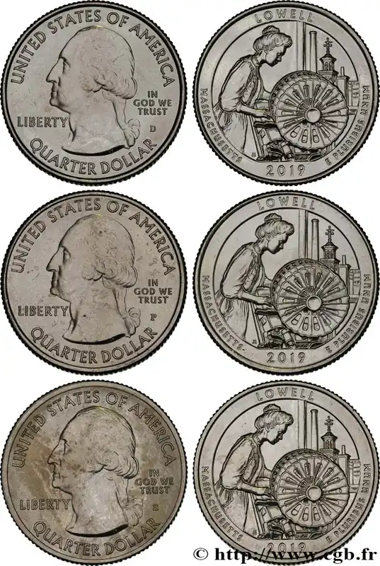 Type : Lot de 3 monnaies 1/4 Dollar Lowell National Historical Park -MassachusettsDate : 2019Nom de l’atelier/ville : Philadelphie-Denver-San FranciscoQuantité frappée : -Métal : cupro-nickelDiamètre : 24,30 mmAxe des coins : 6 h.Poids : 5,67 g.Tranche : canneléeRéférence ouvrage :KM21/-  – Y.- AversTitulature avers : UNITED STATES OF AMERICA / QUARTER DOLLAR.Description avers : portrait à gauche de Georges Washington.ReversTitulature revers : LOWELL // MASSACHUSETTS2018 E PLURIBUS UNUM.Description revers : ouvrière dans une filature, vue de Lowell et de la Boott Mill clock tower.CommentaireLancé au début 2010, ‘America the beautiful’ est un programme de frappe de 56 monnaies commémoratives de 1/4 dollar illustrant les parcs nationaux et d’autres sites nationaux des États-Unis d’Amérique.Le Lowell National Historical Park est un site historique fondé en 1978 dans la ville de Lowell dans le Massachusetts. Il est consacré à l’évocation de la Révolution Industrielle avec la présence de très nombreuses anciennes filatures et usines textiles.HistoriqueÉTATS-UNIS D’AMÉRIQUE