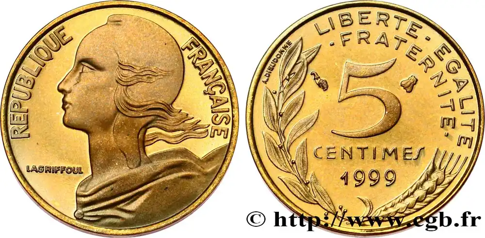 Type : 5 centimes Marianne, BE (Belle Épreuve)Date : 1999Nom de l’atelier/ville : PessacQuantité frappée : 10000Métal : bronze-aluminiumDiamètre : 17 mmAxe des coins : 6 h.Poids : 2 g.Tranche : lisseDegré de rareté : R1Commentaires sur l’état de conservation :Singulière patineRéférence ouvrage :Classement FRANC 2023 / FRANC 2023 classificationF.125/43 var.AversTitulature avers : REPUBLIQUE FRANÇAISE.Description avers : Buste habillé de la République aux cheveux longs à gauche, les cheveux et les rubans du col au vent, coiffée d’un bonnet phrygien ; dans le champ, devant le cou dans le champ gauche LAGRIFFOUL.ReversTitulature revers : LIBERTE – EGALITE / – FRATERNITE -.Description revers : 5 / CENTIMES en deux lignes dans le champ, encadré des différents, au-dessus de 1999, le tout contenu dans une branche de laurier et un épi de blé ; à gauche de la branche de laurier, contre le listel, A. DIEUDONNE..CommentaireExemplaire sous capsule issu d’une série Belle Épreuve.HistoriqueCINQUIÈME RÉPUBLIQUE(depuis le 08/01/1959) La Cinquième République, dont la constitution a été approuvée par référendum le 28 septembre 1958 par plus de 79 % des Français, ne débute officiellement qu’avec l’installation du général de Gaulle comme président le 8 janvier 1959. La constitution est modifiée le 28 octobre 1962 par référendum où une majorité de 62 % des voix approuve l’élection du président de la République au suffrage universel direct. Les différents présidents de la Ve République sont Charles de Gaulle (8/01/1959 – 27/04/1969, retrait et Alain Poher devient président par intérim), Georges Pompidou (15/06/1969 – 2/04/1974, décédé, Alain Poher devient président par intérim), Valéry Giscard d’Estaing (19/05/1974 – 21/05/1981), François Mitterrand (21/05/1981 – 7/05/1995), Jacques Chirac (7/05/1995 – 16/05/2007) , Nicolas Sarkozy (16/05/2007 – 15/05/2012), François Hollande (15/05/2012 – 14/05/2017) et Emmanuel Macron (14/05/2017 – ).