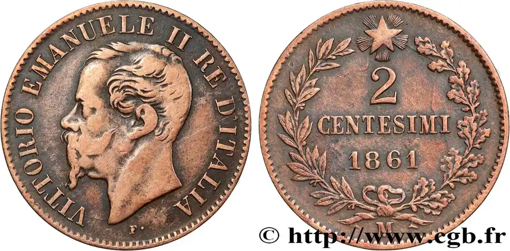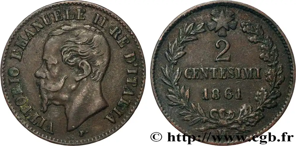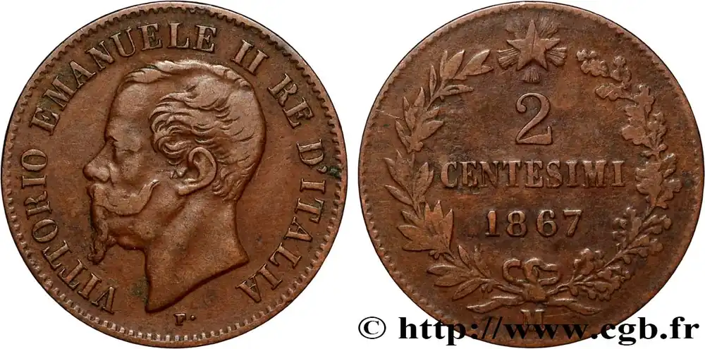 Type : 2 Centesimi Victor Emmanuel IIDate : 1867Nom de l’atelier/ville : TurinQuantité frappée : 5000000Métal : bronzeDiamètre : 20 mmAxe des coins : 6 h.Poids : 2,03 g.Tranche : lisseRéférence ouvrage :Mont.257 – KM19/2.3 AversTitulature avers : VITTORIO EMMANUELE II RE D’ITALIA.Description avers : portrait à gauche.ReversTitulature revers : 2 / CENTESIMI / 1867 // T.Description revers : dans le champ entre deux rameaux et lettre d’atelier.HistoriqueITALIE