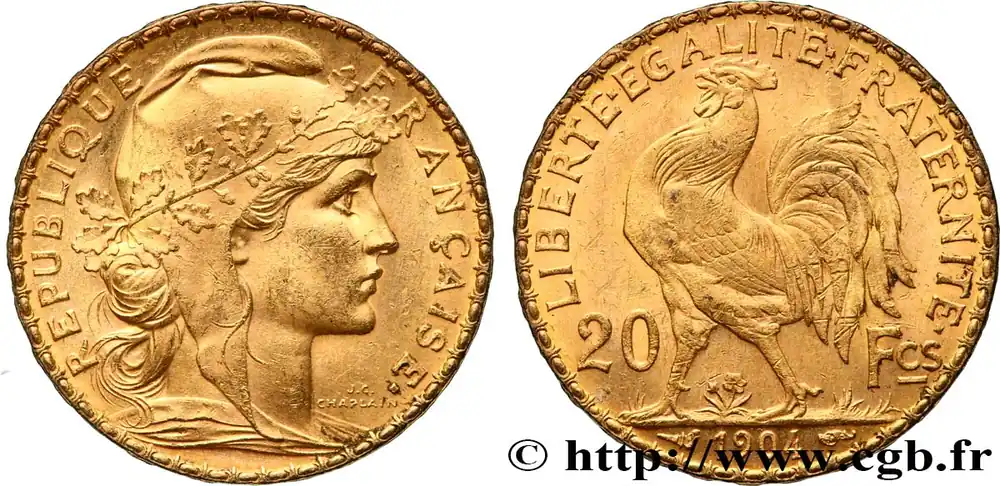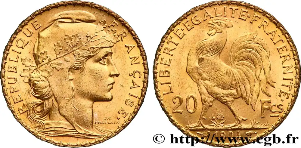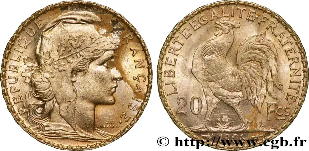 Type : 20 francs or Coq, Dieu protège la FranceDate : 1900Nom de l’atelier/ville : ParisQuantité frappée : 615425Métal : orTitre en millième : 900 ‰Diamètre : 21 mmAxe des coins : 6 h.Poids : 6,45 g.Tranche : inscrite en relief +* DIEU *+ +* PROTEGE *+ +* LA FRANCE *+Degré de rareté : R1SlabPCGS : MS63Commentaires sur l’état de conservation :Sous coque PCGS MS63Référence ouvrage :Classement FRANC 2023 / FRANC 2023 classificationF.534/4AversTitulature avers : REPUBLIQUE – FRANÇAISE..Description avers : Buste de Marianne drapée à droite, coiffée du bonnet phrygien décoré d’une branche de chêne ; signé J.C. CHAPLAIN devant le cou.ReversTitulature revers : LIBERTE EGALITE FRATERNITE// 20 – FCS// 1900.Description revers : Coq passant à gauche, date à l’exergue.HistoriqueTROISIÈME RÉPUBLIQUE(4/09/1870-10/07/1940) La nouvelle de la capitulation de Sedan provoque la révolution du 4 septembre 1870 à Paris. Proclamée à l’Hôtel de Ville, la République est dotée d’un gouvernement provisoire appelé gouvernement de la Défense nationale. Menacé à gauche par l’insurrection de la Commune et à droite par les monarchistes, le nouveau régime connaît des débuts difficiles. Chef du pouvoir exécutif dans un premier temps (février 1871), Thiers est chargé de réorganiser le pays avant de choisir sa forme de gouvernement. Il devient président de la République en août 1871 et, malgré son action de libération du territoire, doit quitter son poste en mars 1873 face à l’opposition royaliste. Il est alors remplacé par Mac-Mahon favorable au rétablissement de la monarchie mais celle-ci n’est pas restaurée à la suite de la question du drapeau. La loi du septennat est alors mise en place en novembre 1873 puis, en 1875, sont votées les lois fondamentales qui servent de Constitution à la Troisième République. Régime parlementaire, elle se caractérise notamment par la nette prépondérance du pouvoir législatif sur le pouvoir exécutif. Anticléricale, la Troisième République rend l’école gratuite, laïque et obligatoire mais continue la politique coloniale pour ses ambitions économiques, stratégiques et morales. La séparation des Églises et de l’État est votée en 1905. L’idée d’une revanche sur l’Allemagne et un nationalisme important sont au cœur de la crise boulangiste, du scandale de Panama ou de l’affaire Dreyfus des années 1886-1899 tandis que la politique étrangère est très active notamment au Maroc et que la course aux armements se développe. La Première Guerre mondiale coûte cher à la France qui ne se relève qu’à partir de 1920 voire 1928 pour la monnaie avec le franc « Poincaré ». La crise de 1929 ne se fait sentir qu’à partir de 1932 mais dure jusqu’en 1939, période durant laquelle l’instabilité ministérielle est très importante. Vacillant en 1934, la Troisième République trouve un nouveau ciment unitaire avec l’antifascisme qui permet l’arrivée au pouvoir du Front populaire en 1936. Mais, paralysée face à l’Allemagne, la France va alors s’enliser dans une « drôle de guerre » puis connaître l’une des plus grandes défaites de son histoire en juin 1940. Réunies en Assemblée nationale à Vichy le 10 juillet 1940, les Chambres, pourtant élues en 1936, votent les pleins pouvoirs à Pétain dans une sorte de suicide collectif par 569 voix pour, 80 voix contre et 18 abstentions.