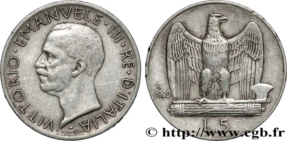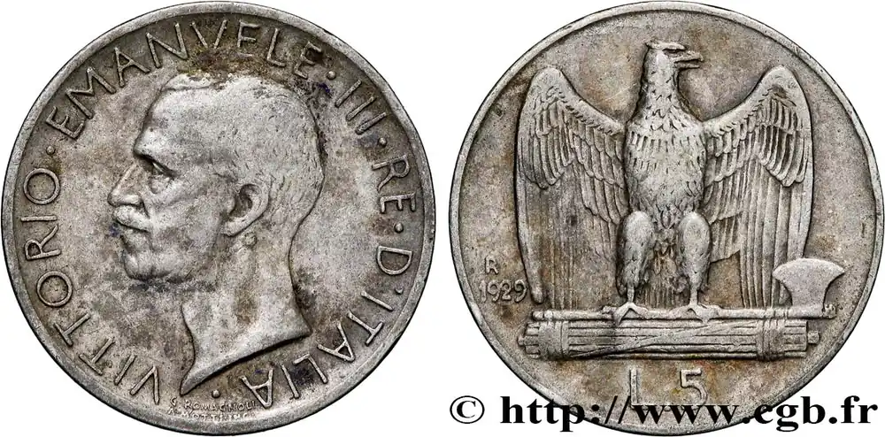 Type : 5 Lire Victor Emmanuel IIIDate : 1927Nom de l’atelier/ville : RomeQuantité frappée : 92887460Métal : argentDiamètre : 23 mmAxe des coins : 6 h.Poids : 5,00 g.Tranche : lisseCommentaires sur l’état de conservation :Traces de nettoyageRéférence ouvrage :Mont.119  – KM20/67.1 AversTitulature avers : VITTORIO.EMMANVELE.III.RE.D’ITALIA.Description avers : portrait à gauche.Traduction avers : (Victor Emmanuel III roi d’Italie).ReversDescription revers : aigle posé sur une faisceau , date et lettre d’atelier.HistoriqueITALIE
