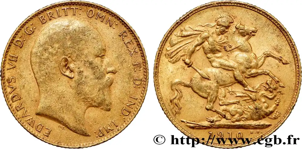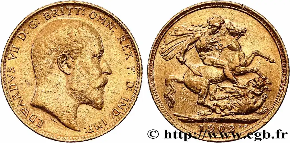 Type : 1 Souverain Edouard VIIDate : 1902Nom de l’atelier/ville : PerthQuantité frappée : 4289122Métal : orTitre en millième : 917 ‰Diamètre : 22 mmAxe des coins : 12 h.Poids : 8 g.Tranche : canneléeCommentaires sur l’état de conservation :Monnaie nettoyéeRéférence ouvrage :Sp.3972 – KM20/15 AversTitulature avers : EDWARDVS VII D: G: BRITT: OMN: REX F. D. IND: IMP:.Description avers : Tête nue d’Édouard VII à droite.Traduction avers : (Édouard VII par la grâce de Dieu roi de tous les Bretons, défenseur de la Foi, empereur des Indes).ReversTitulature revers : À L’EXERGUE : 1902.Description revers : Saint Georges, nu, casqué, le manteau flottant sur l’épaule, tenant un glaive de la main droite, galopant à droite, terrassant un dragon.HistoriqueOR, PALLADIUM ET PLATINE INVESTISSEMENTSécurisez et diversifiez votre épargne avec les métaux précieux :Dans un contexte d’instabilité politique et économique croissante, diversifier son épargne peut être une démarche judicieuse. Les métaux précieux comme l’or, le palladium et le platine constituent des actifs tangibles souvent prisés en raison de leur caractère intemporel et de leur résilience face aux fluctuations des marchés.Pour répondre à des besoins variés, l’achat de pièces officielles en or, palladium ou platine est une option flexible et adaptée. Ces pièces, disponibles à l’unité ou en lot, permettent à chacun d’ajuster ses choix selon ses objectifs et son budget, sans engagement à long terme.Un processus simple et sécurisé :Nous proposons une livraison sécurisée et garantie. Les paiements peuvent être effectués par carte bancaire ou par virement, bien que certaines transactions puissent nécessiter un règlement exclusivement par virement bancaire. Une pièce d’identité valide (carte nationale d’identité ou passeport) sera demandée pour finaliser votre achat.Stockage en toute sécurité et confidentialité :Le département Investissement de CGB Numismatique Paris met à votre disposition des solutions de stockage offrant une sécurité renforcée et une confidentialité optimale pour vos achats en or, palladium et platine.Contactez-nous pour plus d’informations :Pour toute question ou pour passer commande, prenez contact avec notre responsable des achats/ventes de métaux précieux : par email à [email protected] ou par téléphone. Nous mettons à votre disposition des informations générales et des services pour vous accompagner dans vos projets d’investissement.CGB Numismatique Paris agit en tant que fournisseur de métaux précieux et ne fournit aucun conseil en investissement. La valeur des métaux précieux peut fluctuer, et les performances passées ne garantissent pas les résultats futurs. L’achat de métaux précieux doit être considéré comme une stratégie de préservation de valeur plutôt qu’un investissement spéculatif. Conformément à l’article L.221-28 du Code de la consommation, le droit de rétractation ne s’applique pas aux achats d’or d’investissement, dont le prix dépend des fluctuations des marchés financiers.