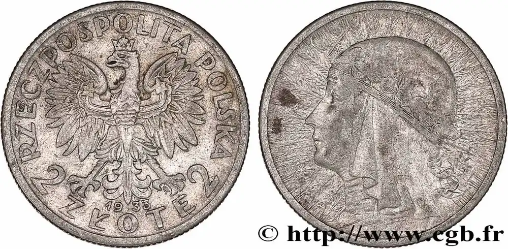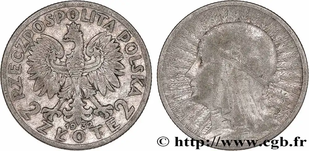 Type : 2 Zlote Reine JadwigaDate : 1932Nom de l’atelier/ville : VarsovieQuantité frappée : 15700000Métal : argentTitre en millième : 750 ‰Diamètre : 22 mmAxe des coins : 12 h.Poids : 4,52 g.Tranche : canneléeCommentaires sur l’état de conservation :Légères traces de nettoyageRéférence ouvrage :KM20/20 AversTitulature avers : RZECZPOSPOLITA POLSKA / 2 ZŁOTE 2.Description avers : emblème à l’aigle couronné.ReversDescription revers : portrait à gauche de la Reine Jadwiga, épis de blé.HistoriquePOLOGNE